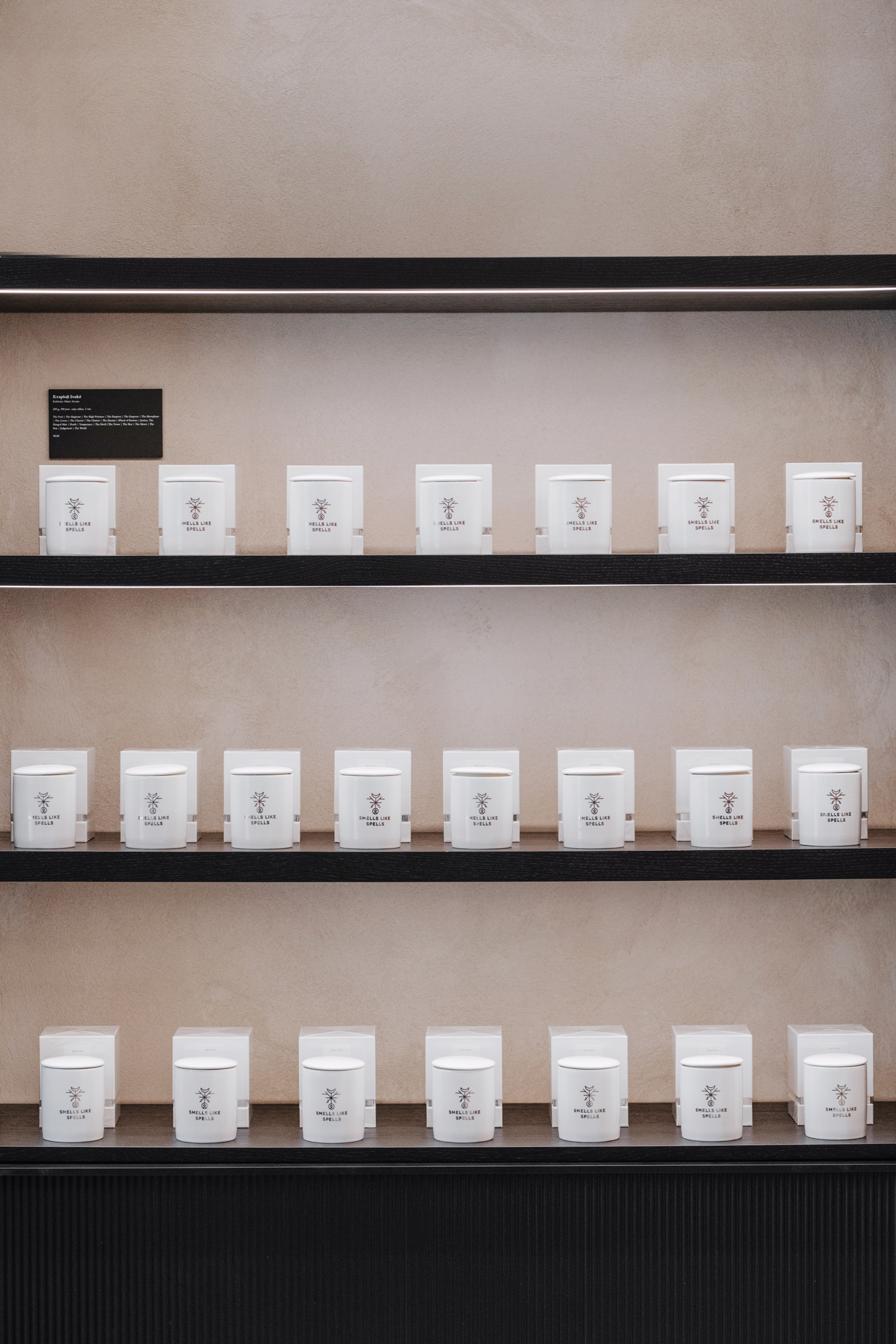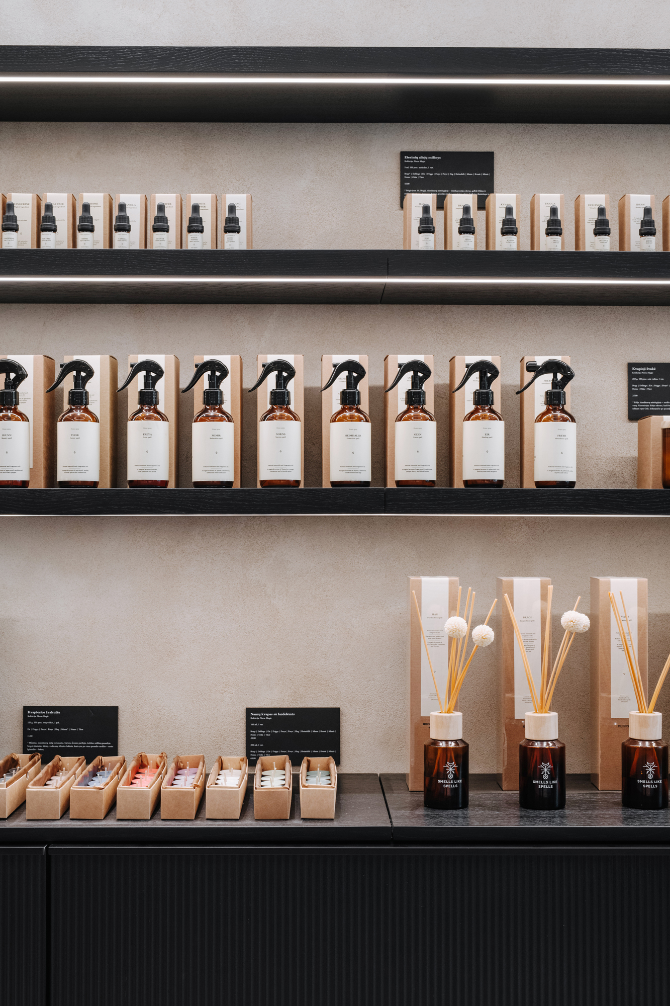 „Smells Like Spells“ parduotuvės erdvė buvo ne tiesiog atnaujinta – ji buvo atidengta, išgirsta, išvalyta. Čia užėjusįjį pasitinka švelni, vos juntama vyno, vaško, akmens kvapų dermė, kuri neprimeta savo buvimo, bet tyliai egzistuoja.