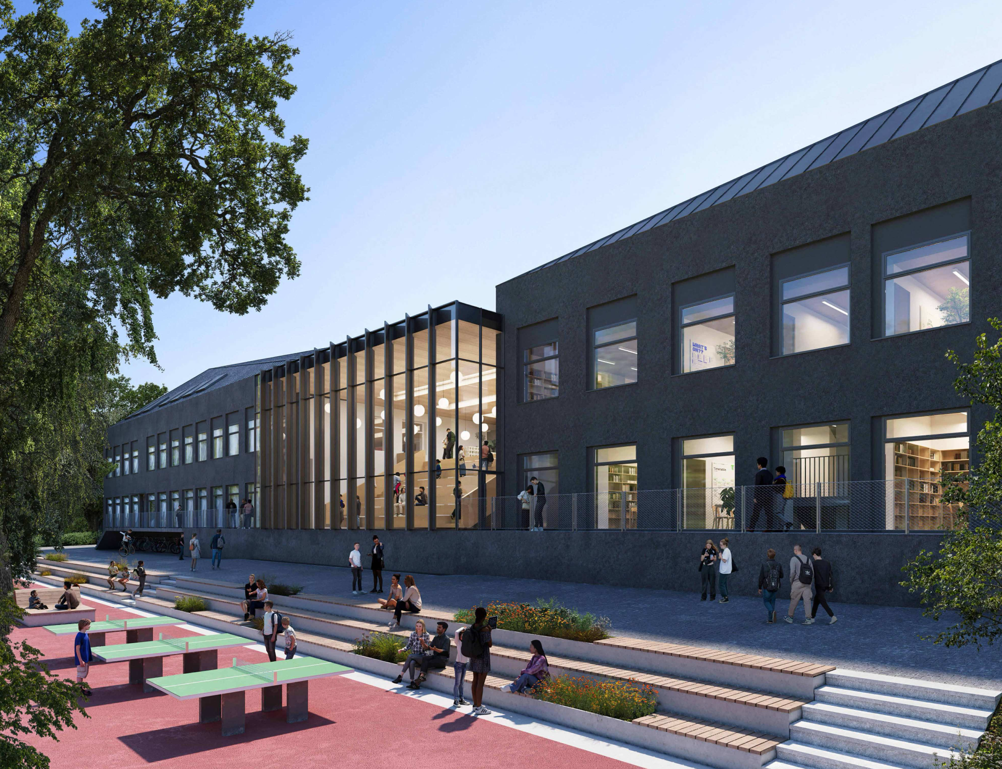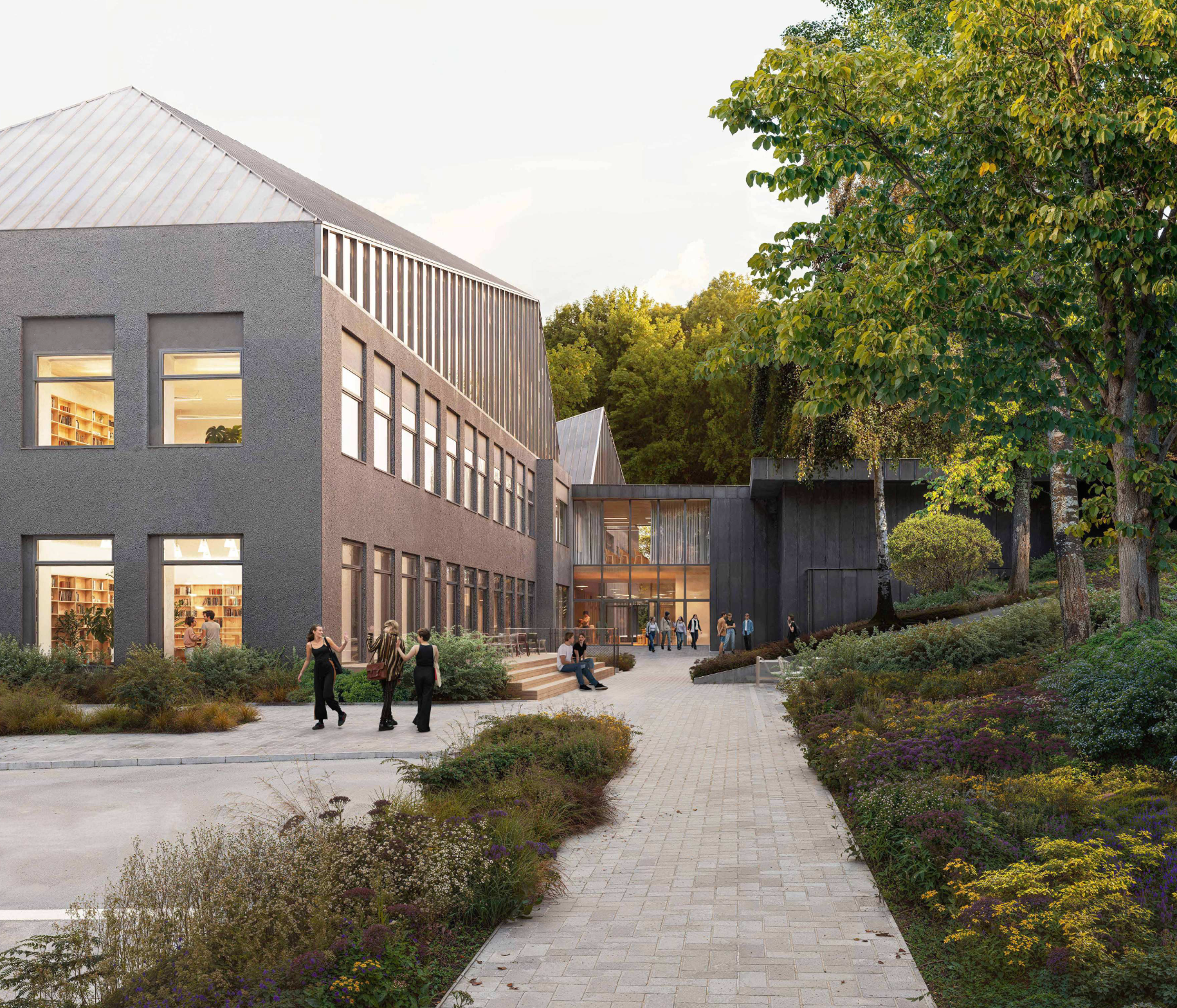 Esami pastatai, iki šiol tarnavę skirtingoms – mokslo ir sporto – funkcijoms, bus sujungti į vieningą mokyklos kompleksą. Siekiant padidinti naudingo ploto apimtį nedidinant užstatymo ribų, nauji tūriai projektuojami ant esamų konstrukcijų. Ant darželio korpuso numatytas trečias aukštas su laužytos formos šlaitiniu stogu, interpretuojančiu tradicinę senamiesčio stogo geometriją šiuolaikine kalba.