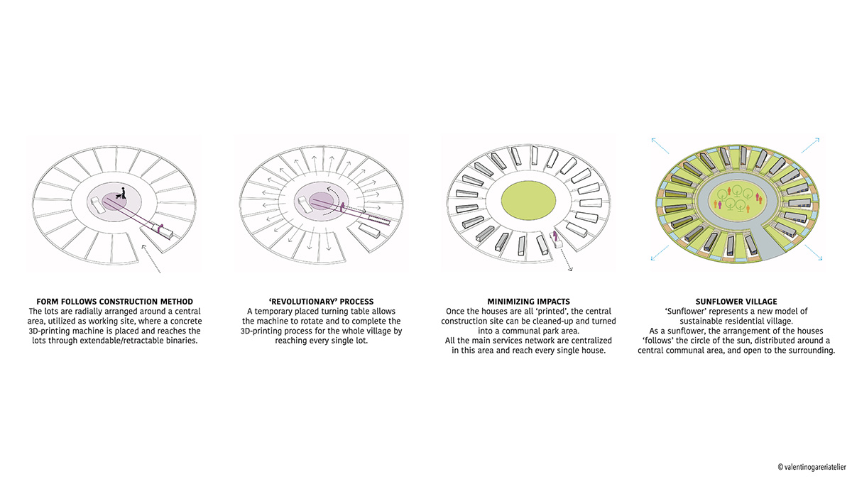 Tokios gyvenvietės bus statomos ypatingu būdu: pagrindinė statybų aikštelės zona buvo teritorijos viduryje. Ten įrengtas 3D spausdinimo aparatas iš eilės vieną po kito spausdins visus 19 namų. Pasak projekto autoriaus, toks statybų metodas labiau nei įprastas metodas skatina tvarumą.