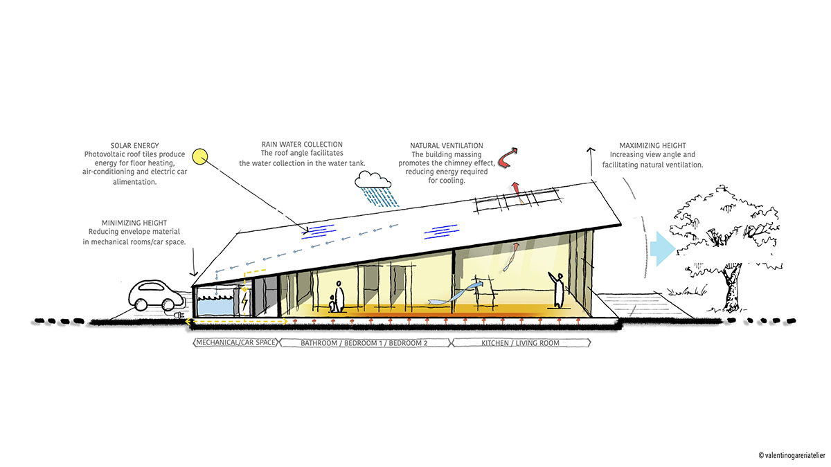 Atskleistose projekto nuotraukose matyti, kad namų stogai taip pat specialūs – tai saulės spindulių kolektoriai, pakreipti tokiu kampu, kad geriau įsisavintų energiją. Surinkta energija naudojama grindų šildymui, oro vėdinimui ir kitoms reikmėms.