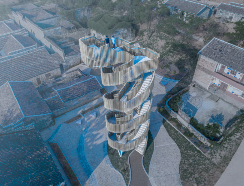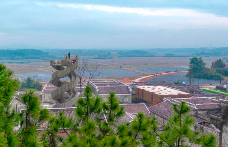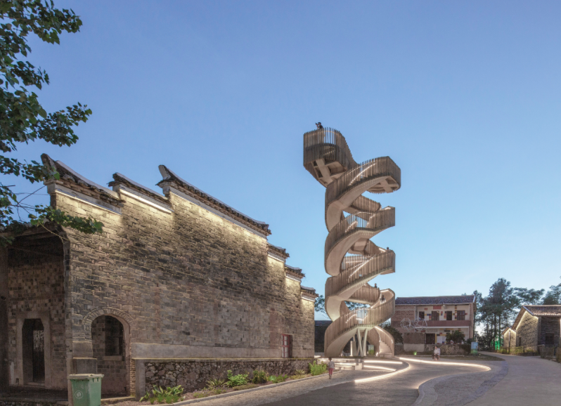 Iš apžvalgos bokšto atsiveria panorama, taip pat kaimo ir kalnų kraštovaizdžio horizontas. Laikrodžio bokštas yra vadinamas „Klajojančiu bokštu“, primenančiu garsaus kinų poeto Li Bai eilėraštį apie žmones, laukiančius artimųjų sugrįžimo į savo gimtąjį namą. Kaimo centre centre – nauja viešoji salė. Salė pastatyta buvusioje kiemo pusėje, kuris buvo sugriautas per kultūrinę revoliuciją. Unikali stogo forma kilusi iš šimtamečio kampinio medžio, esančio už kaimo ribų, kurio kilnus baldakimas dešimtmečiais suteikė kaimo gyventojams susibūrimo vietą. Salė ištirpsta kaimo audinyje ir suteikia saugią kolektyvo erdvę. Terakotos plytelėmis klijuotame fasade yra vietos paukščiams susikurti lizdus.