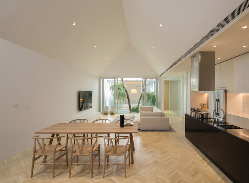 Tai taip pat užmezga ryšį su gamta ir dideliu medžiu, išeinančiu iš namo per atvirą stogą, kuris užlieja erdvę natūralia šviesa.