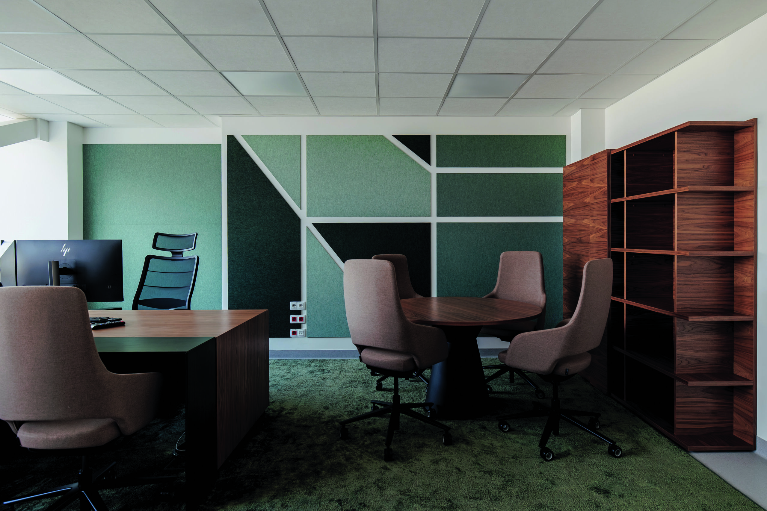 Ypatinga reikšmė suteikiama ir akustiniams sprendiniams. Poilsio erdvėse ir prie darbuotojų daiktadėžių integruotuose akustiniuose elementuose subtiliai paslėptas stilizuotas Lietuvos žemėlapio kontūras, dengtas rudos spalvos PET veltinio plokšte. Tai ne tiesmukas simbolis, o tylus pasakojimas – apie darbą, susijusį su Lietuvos žeme, apie atsakomybę ir tęstinumą. Akustinės užuolaidos tarp darbuotojų kabinetų, atskirtų stiklinėmis vitrinomis, atlieka ir emocinę funkciją – suteikia privatumo, minkština erdvę, kuria vizualinį ritmą.
