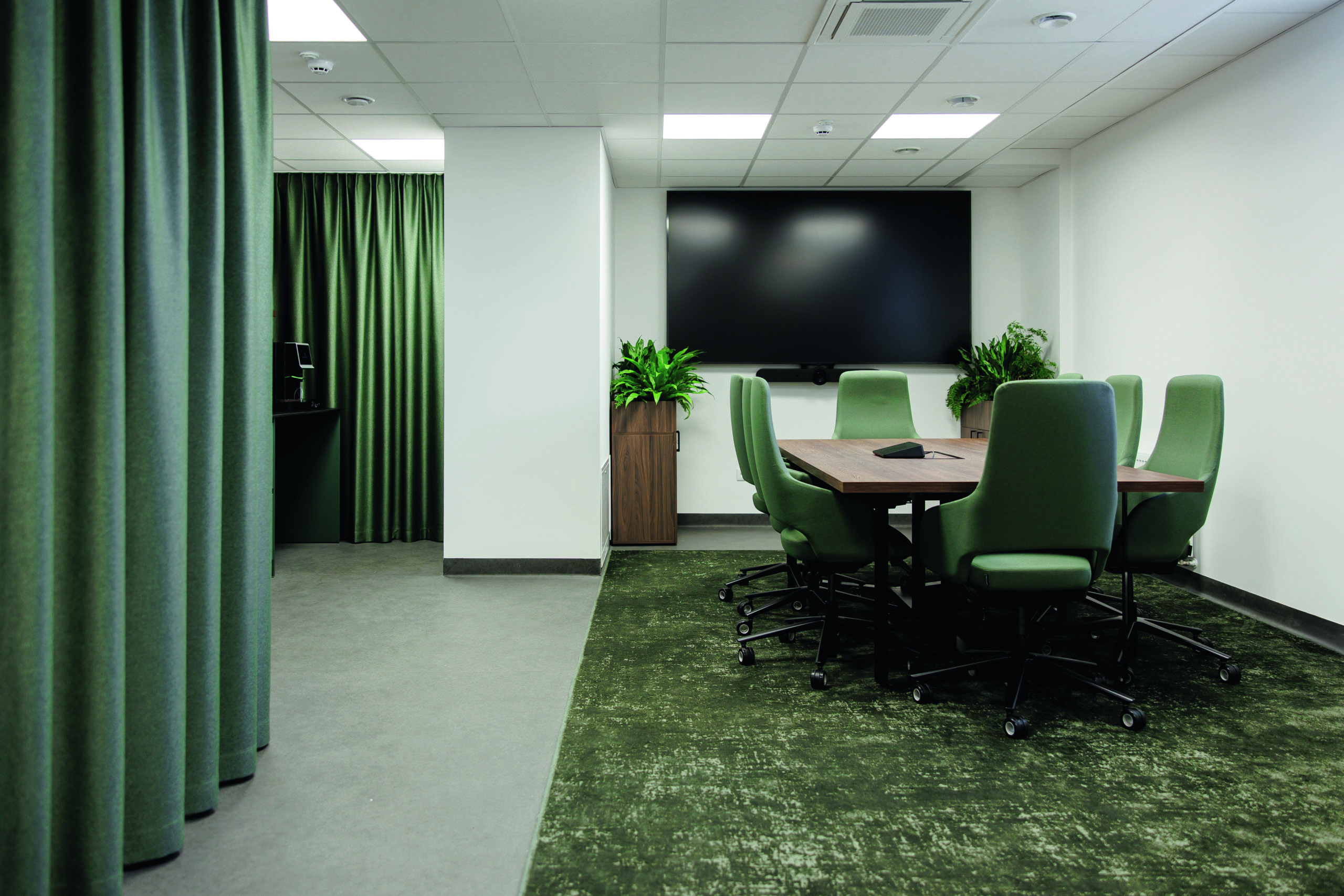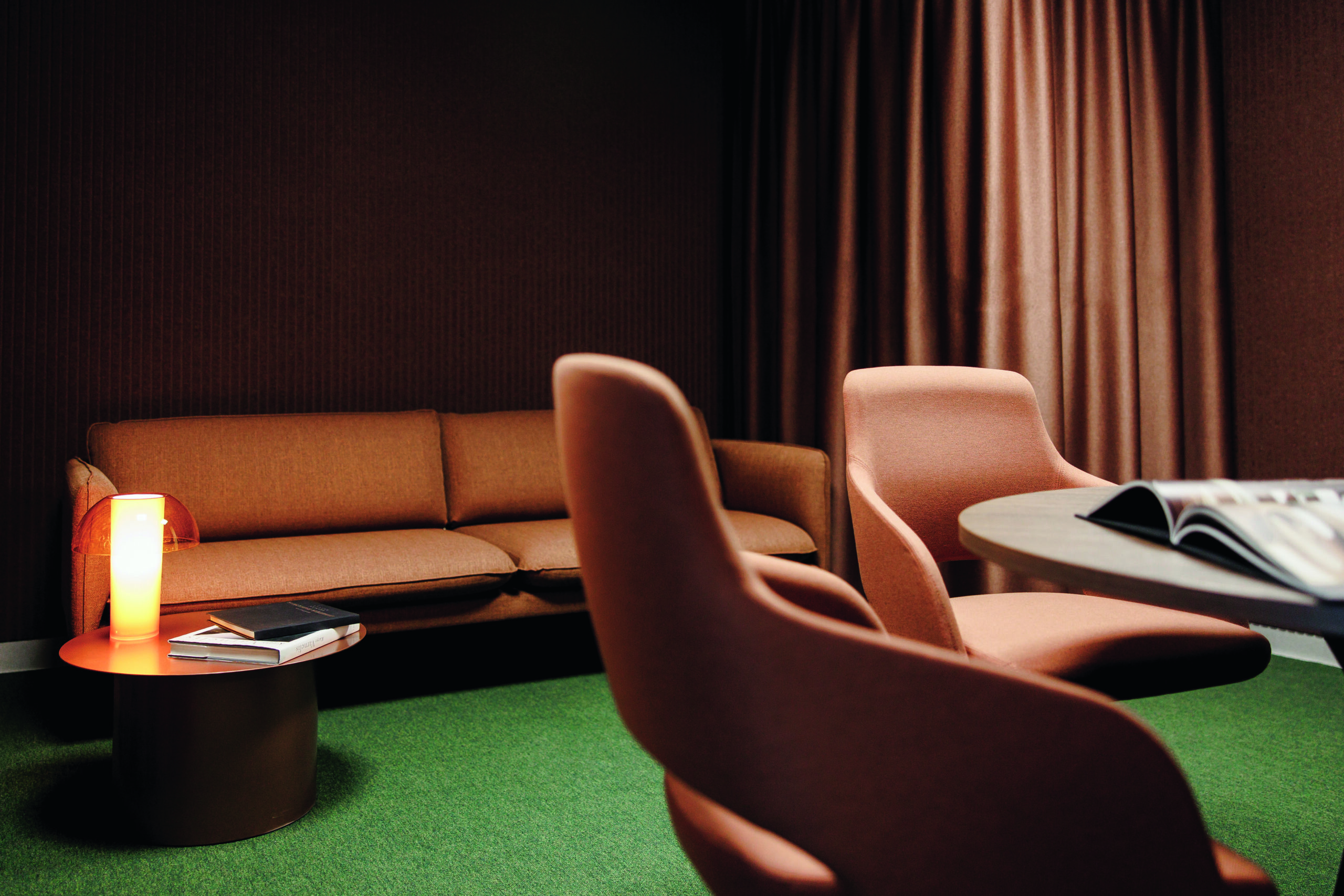 Iš gausaus UŽUOLAIDĖLĖS audinių asortimento visoms patalpoms buvo pasirinkta vienos rūšies, tačiau skirtingų, su kitais interjero sprendiniais derančių žalios ir terakotinės spalvų medžiaga – viešosioms erdvėms tinkamas dekoratyvinis dimout audinys iš TREVIRA CS®ugniai atsparių pluoštų. Audinys sertifikuotas pagal OEKO-TEX, todėl saugus naudoti kasdienėje aplinkoje. Sluoksninė audinio struktūra iš dalies sulaiko šviesą, o subtiliai dryžuotas, lengvai blizgus paviršius su melange efektu suteikia vizualinio gyvumo. Audinys gerai krinta, beveik nesiglamžo ir mažina aidėjimą stiklinėmis pertvaromis atskirtose patalpose (αw = 0,70, C klasė). Dėl skirtingo patalpų lubų aukščio pritaikyti skirtingi karnizų sprendimai – sieniniai karnizai ir lubiniai bėgeliai. UŽUOLAIDĖLĖS meistrai taip pat pagamino ir sumontavo prie interjero priderintas medines žaliuzes.