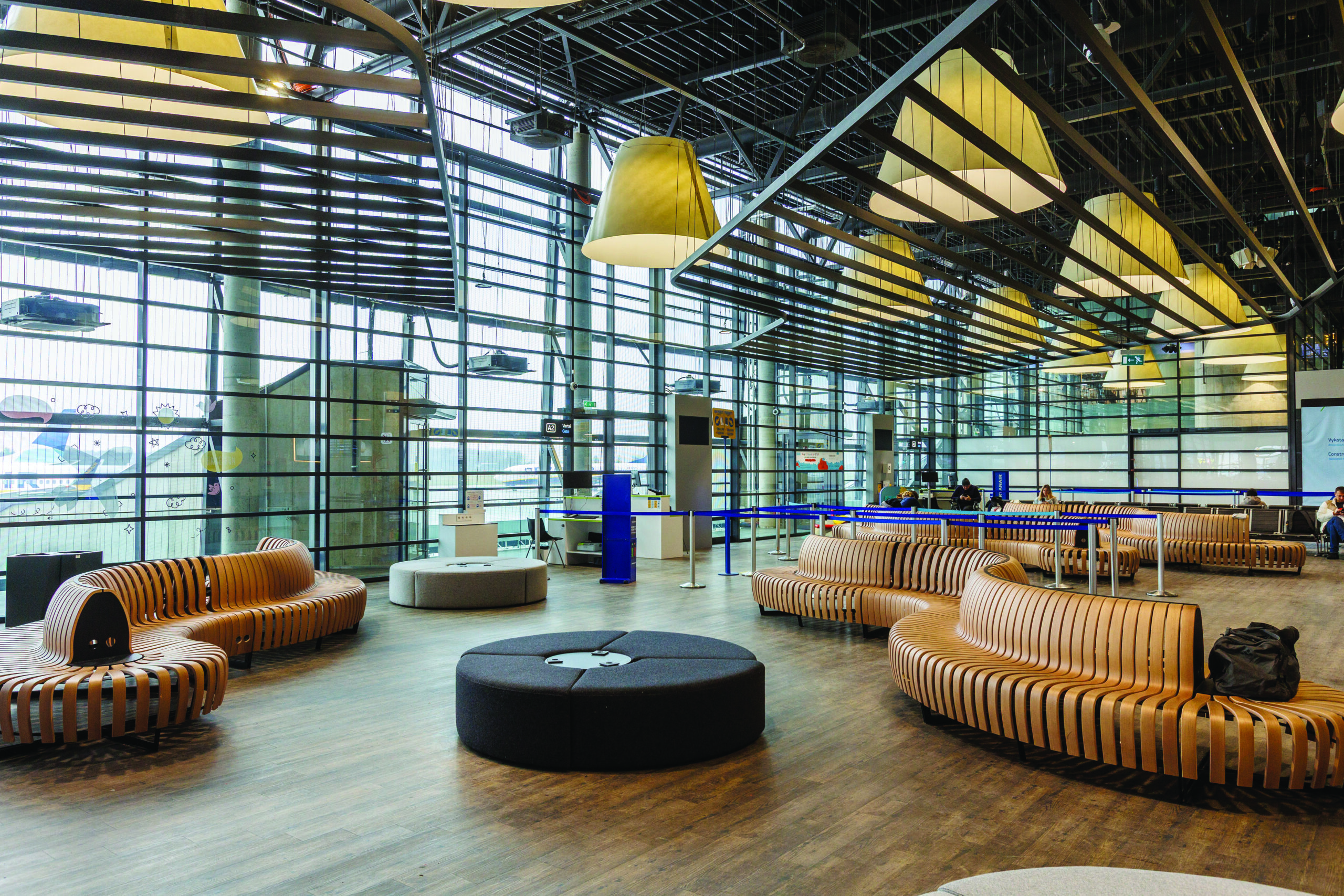 Specialiai terminalui pagamintos įspūdingos segmentinės ekstruduoto aliuminio lubos primena pakibusius ore debesis.