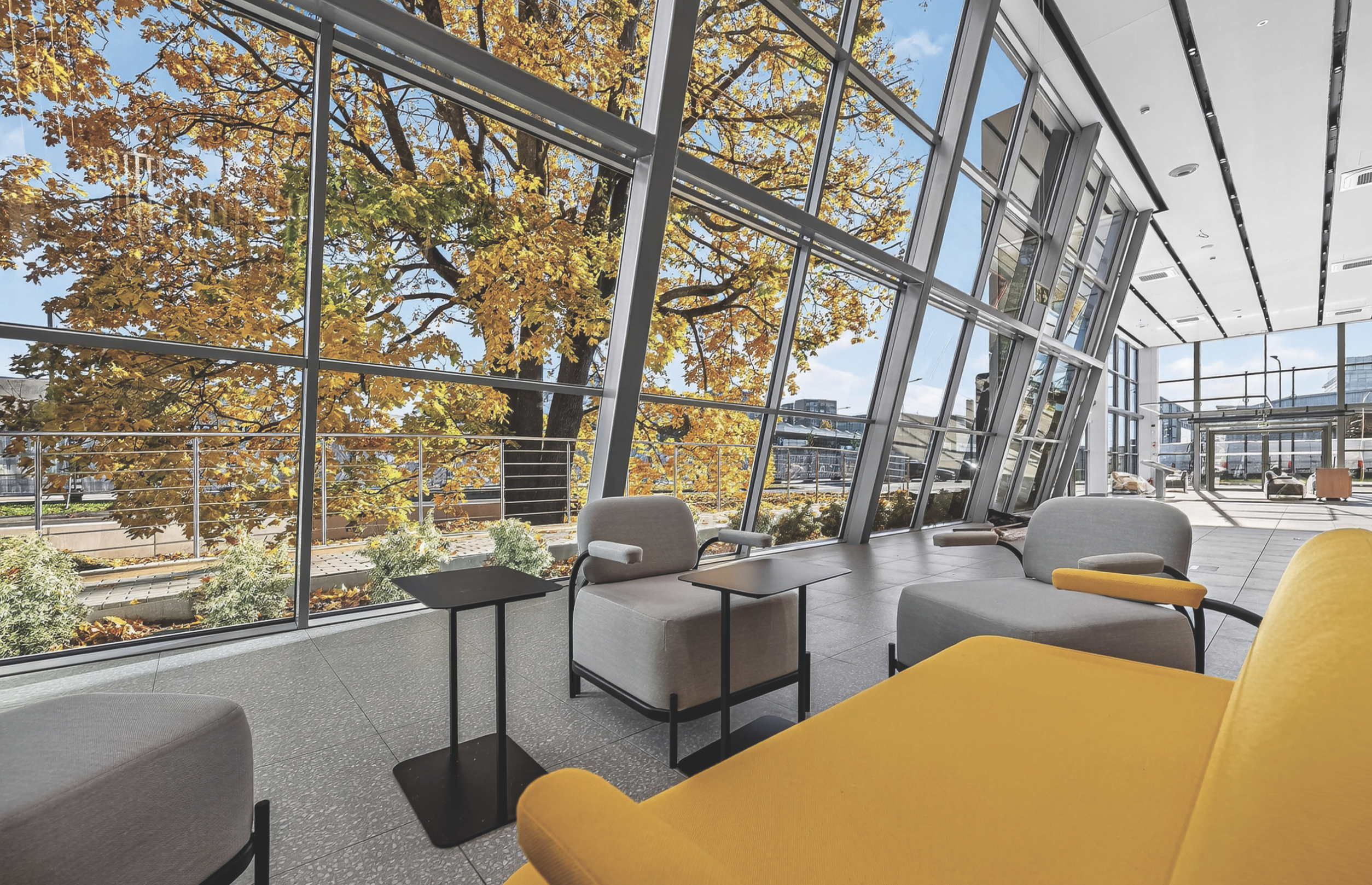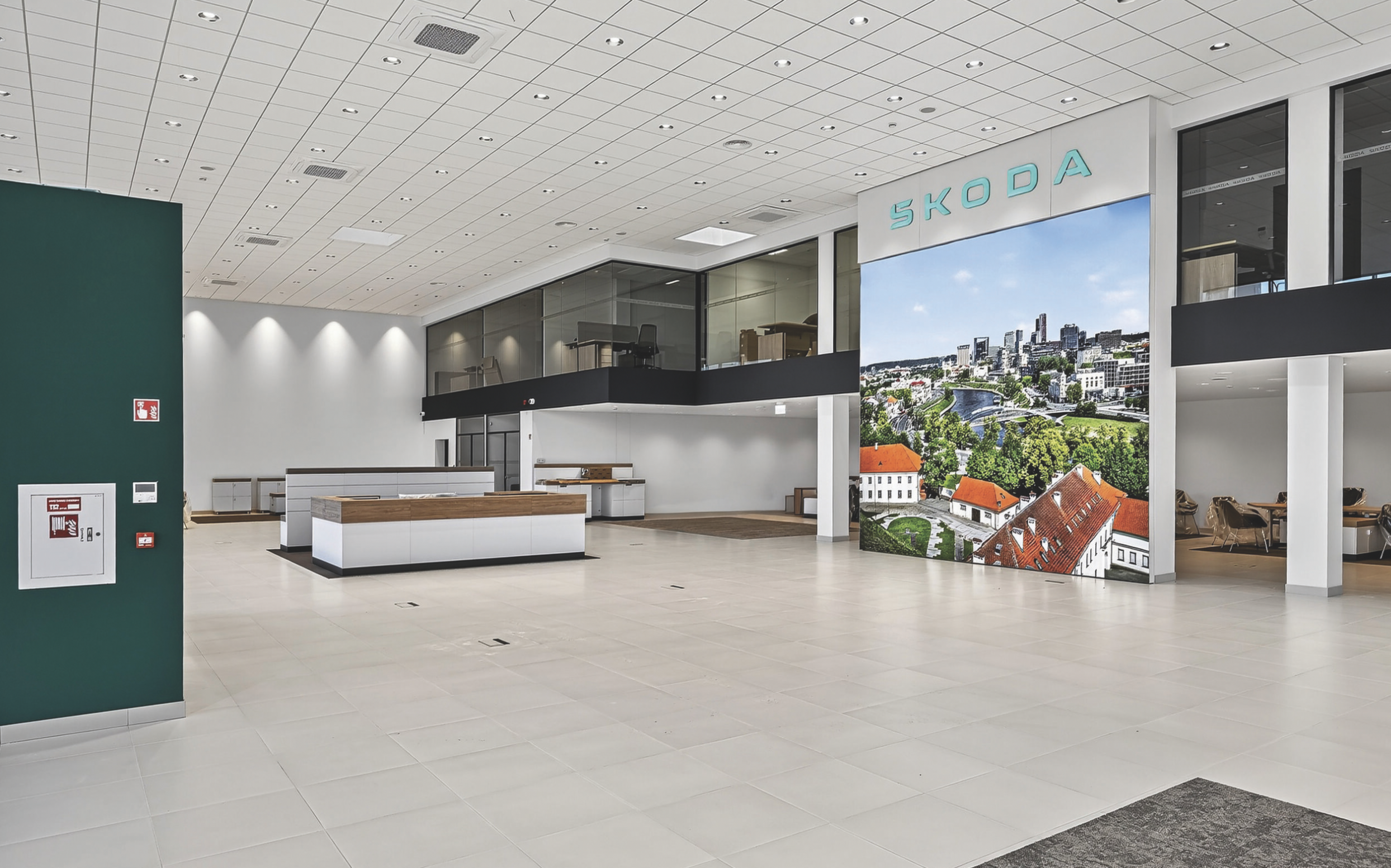 ŠKODA automobilių ekspozicijos salės ir klientų aptarnavimo zonos interjeras – švarių, paprastų formų, achromatinių spalvų, dėmesys sutelkiamas į eksponuojamus naujus automobilius. Akcentas – logotipo siena su Vilniaus miesto panoramos fototekstile. Šiuos sprendinius padiktavo ŠKODA standartai.