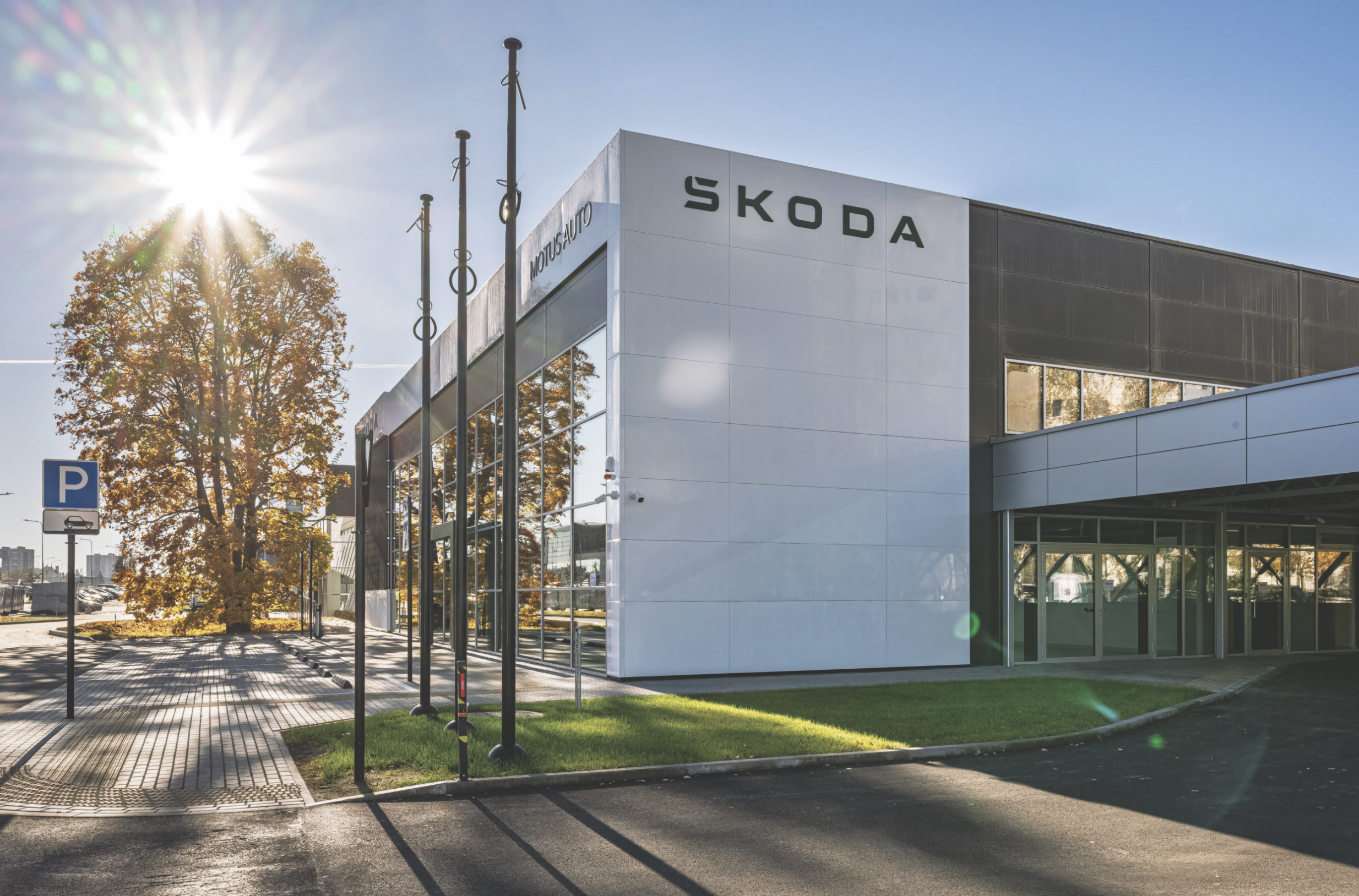 ŠKODA dalyje dominuoja modernūs sprendimai. Pavyzdžiui, vietoje tradicinio spaudos plakato lauke įrengtas įspūdingas 50 kv. m ploto LED ekranas, jame dinamiškai pristatomos naujienos ir technologijos. Klientų zonoje įdiegta papildomų patogumų, užtikrinančių komfortą vizito metu.