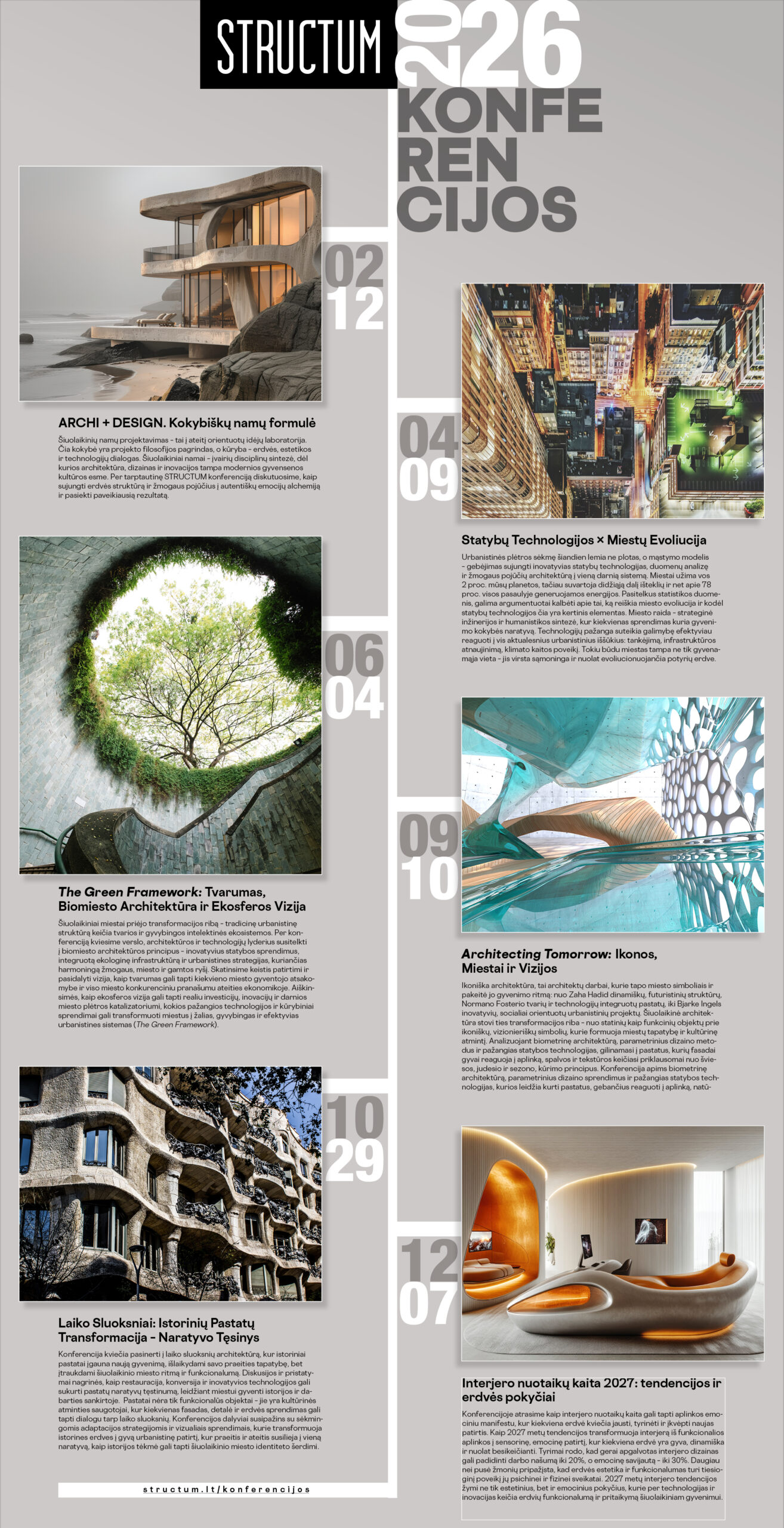 Tarptautinė STRUCTUM konferencija ARCHI + DESIGN. Kokybiškų namų formulė kviečia pažvelgti į kokybę kaip į pamatinę šiuolaikinių namų projektavimo filosofiją. Čia kokybė suprantama ne tik per medžiagiškumą ar techninius sprendimus, bet ir per erdvės pojūtį, ilgaamžiškumą, estetiką bei emocinį ryšį su aplinka.