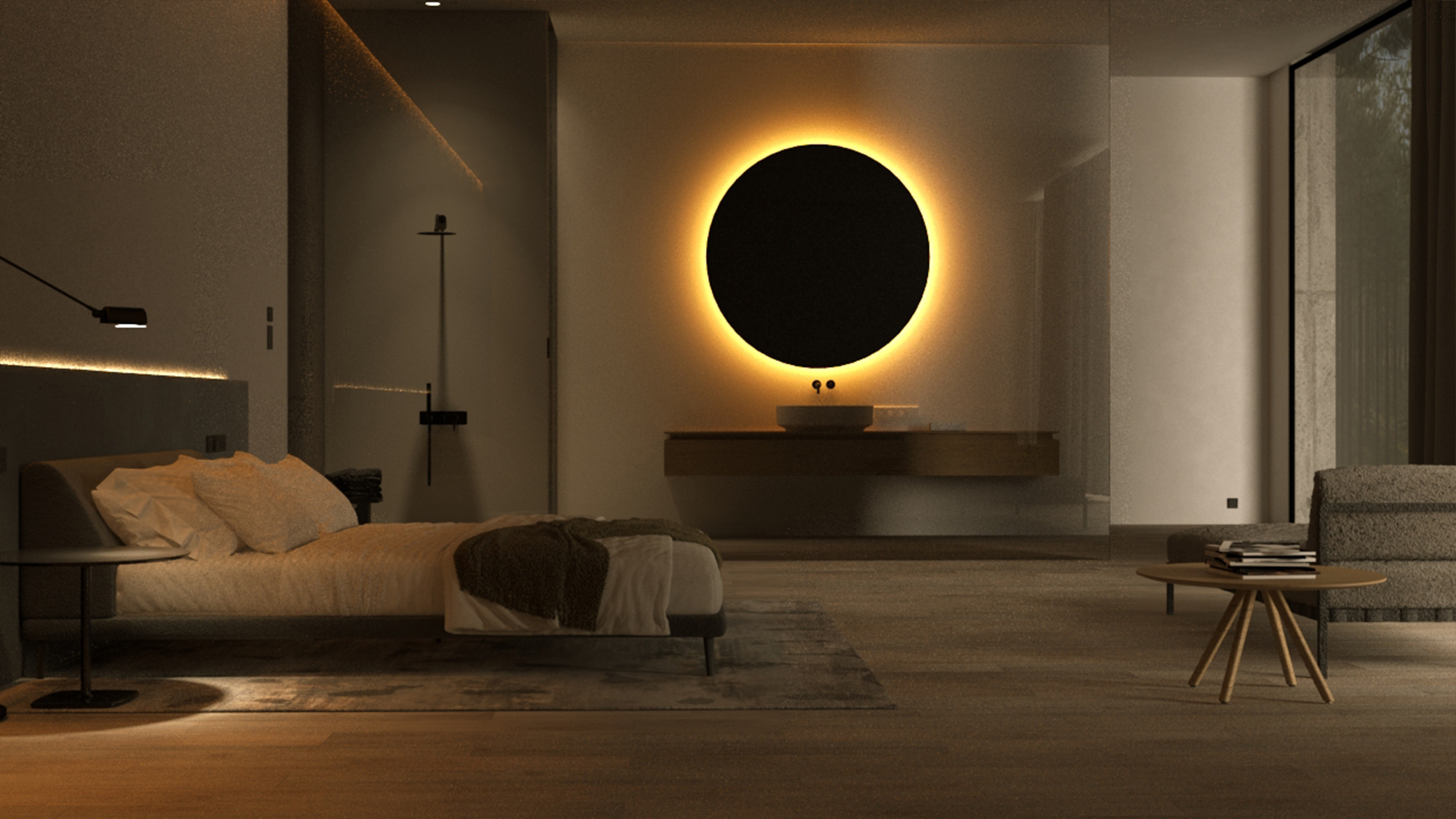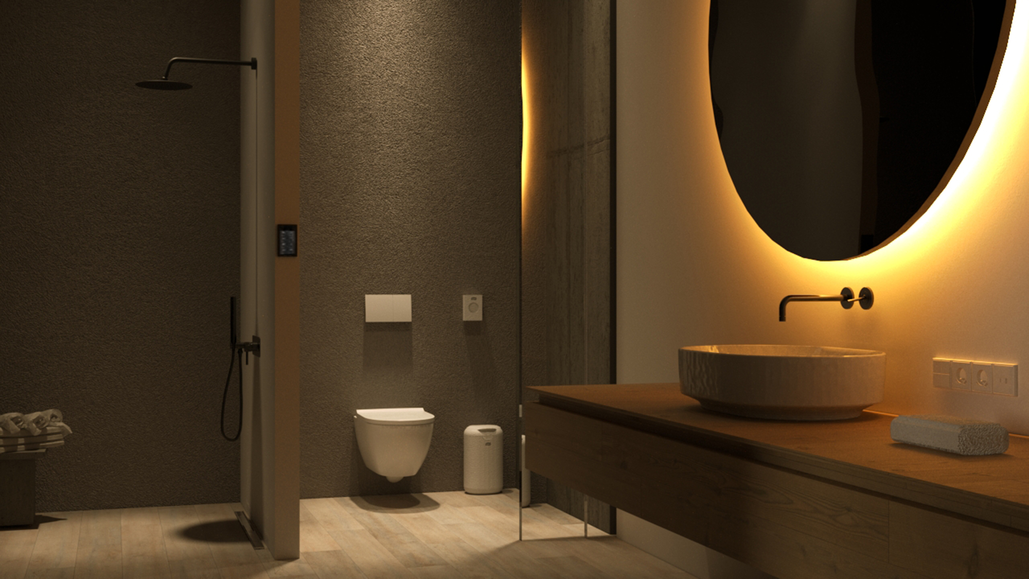 JUNG išmaniosios sistemos leidžia kurti šviesos scenarijus poilsiui, SPA ir kambario erdvėse. „Smart Control 5“ valdymo jungikliai subtiliai integruojami į interjerą, išlaikant minimalistinę estetiką. Projekte pasirinkti metaliniai serijos LS 990 jungikliai. Kambaryje pasirinkti žalvariniai jungikliai ir kištukiniai lizdai puikiai išpildo interjerą ir suteikia papildomą akcentą. Vonioje pasirinkti aliuminio atspalvio kištukiniai lizdai ir jungikliai, kurie įsilieja į interjerą. Be to, šie jungikliai yra ilgaamžiai, atsparūs įbrėžimams, todėl puikiai tinka viešbučio konceptui.