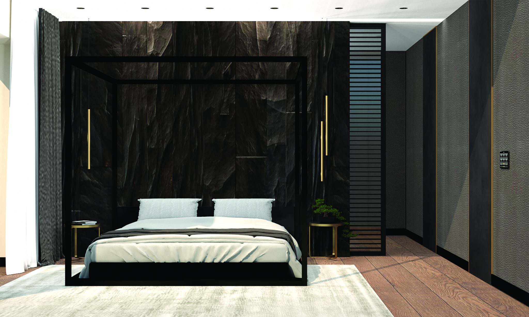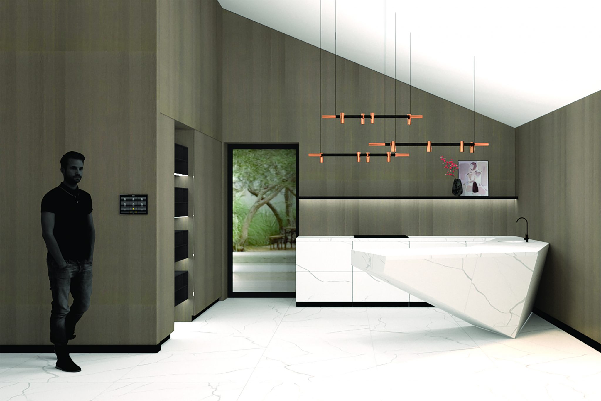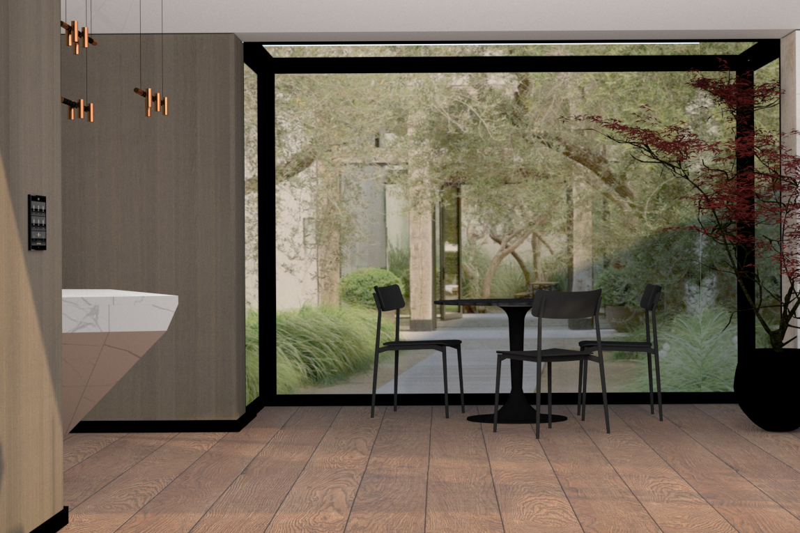 THINK LIGHT. Apšvietimas – tai ne tik priemonė įveikti tamsai. Tinkami apšvietimo sprendimai – galingas įrankis, suteikiantis erdvėms norimą atmosferą ir išskirtinumą, leidžiantis sukurti ypatingą nuotaiką bei pabrėžti interjero unikalumą. Šiam interjerui buvo parinkti įvairios paskirties šviestuvai, kurių intensyvumas gali būti reguliuojamas. Puikus sprendimas – panaudoti gamintojo „One A“ sistemą „Storm System“, leidžiančią įvarius šviestuvus, kameras ir daviklius sumontuoti į vienodus montavimo žiedus lubose. Taip pat pasirinkti šie šviestuvai: „Fiddlehead Cantilever“ (iš „Roll & Hill“), „Glow H 50“ (iš „Ilfari“) ir „X-tendable“ (iš „One A“).