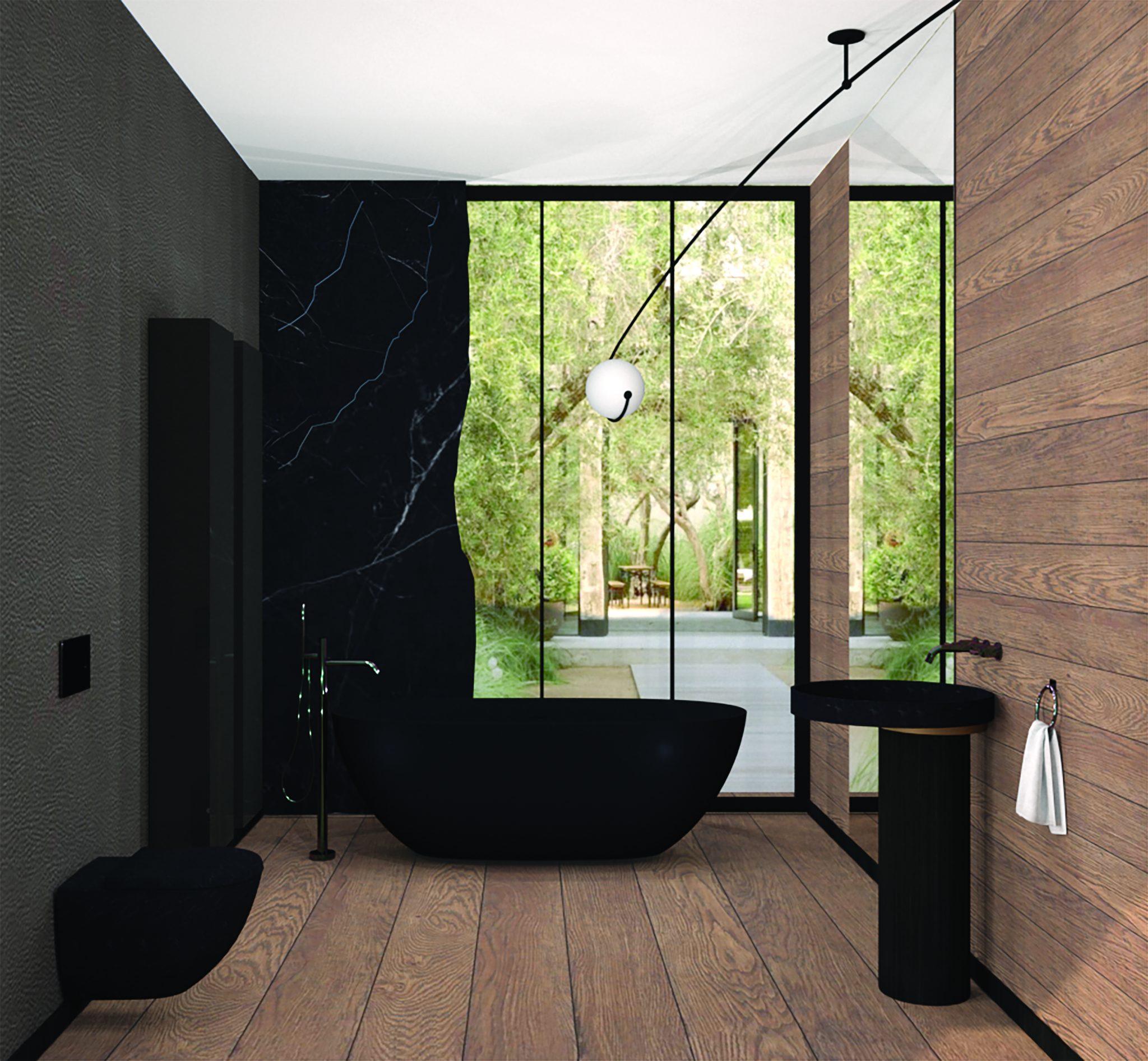 GROHE. Tobulas lakoniškas dizainas, ypatinga danga, patogus valdymas – tai, ko reikia moderniam ir patogiam namui. Dėl išskirtinio dizaino ir nepriekaištingos kokybės parinktas į sieną montuojamas maišytuvas kriauklei ir ant grindų montuojamas maišytuvas su dušu voniai „Grohe Atrio“. Tai aukščiausio lygio dizaino standartą atitinkantis produktas, kuris palengvins kiekvieno gyvenimą. Projekte panaudota ir „Grohe Sense Guard“ – pažangioji vandens kontrolės sistema, kuri „prižiūri“ vandens srautą, slėgį ir temperatūrą vamzdžiuose 24 val. per parą. Savo išmaniuoju telefonu galima sužinoti viską apie vandens situaciją savo namuose.