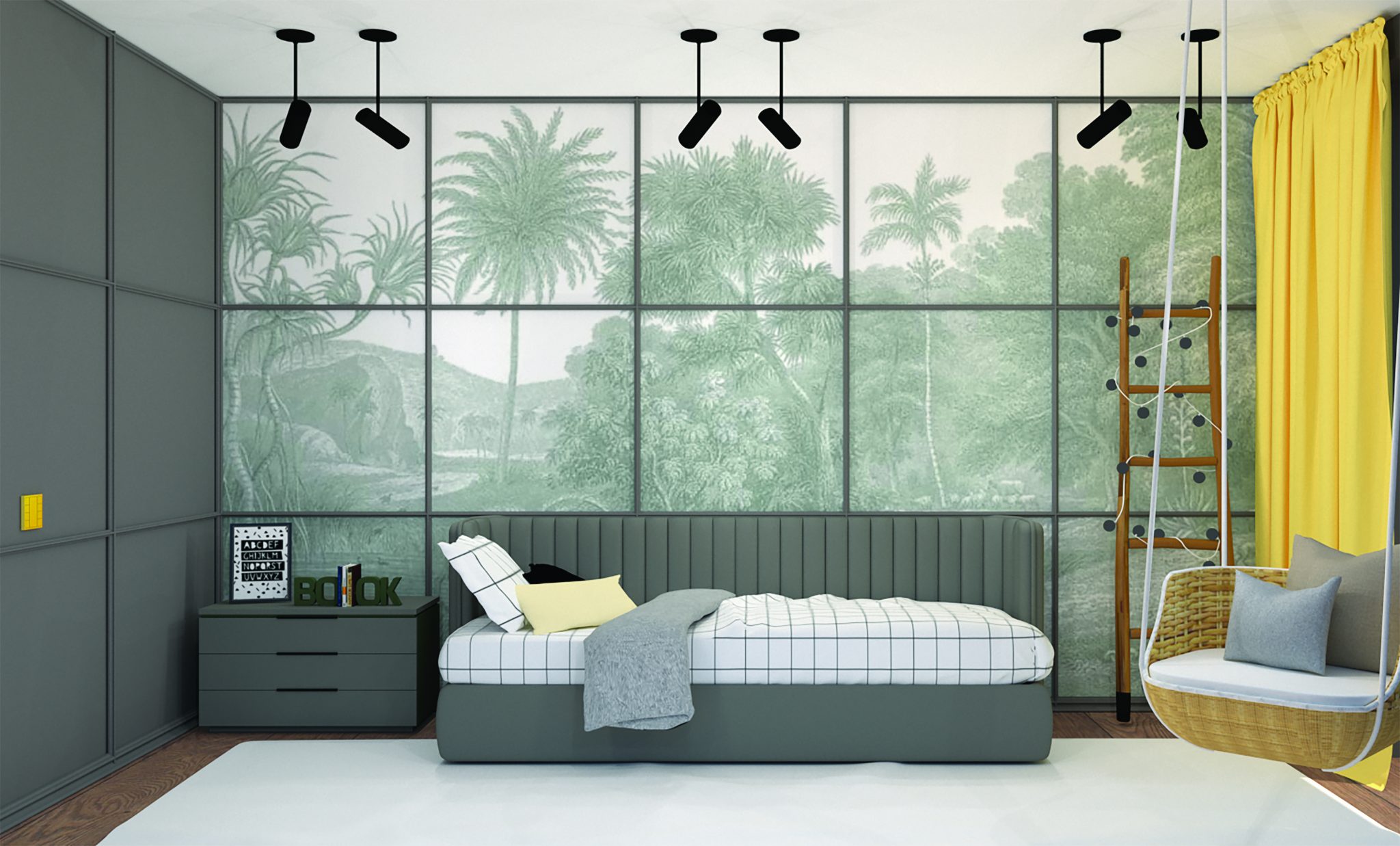 CLASSIC LINE DECOR. Vaiko kambario interjeras atrodo elegantiškai ir žaismingai, jo dekorui buvo naudotos minimalistinės sienų dekoravimo juostos (F-PCR-6003), dažytos kontrastinga pilka spalva. Toks dekoratyvus sprendimas kartu su tapetais kuria įdomesnį dizainą ir idealiai papildo minimalistinį vaizdą.
