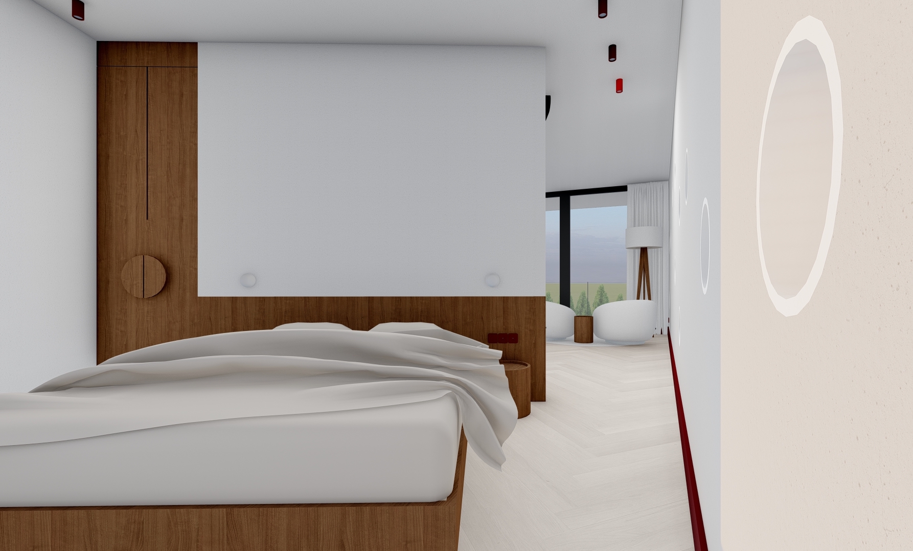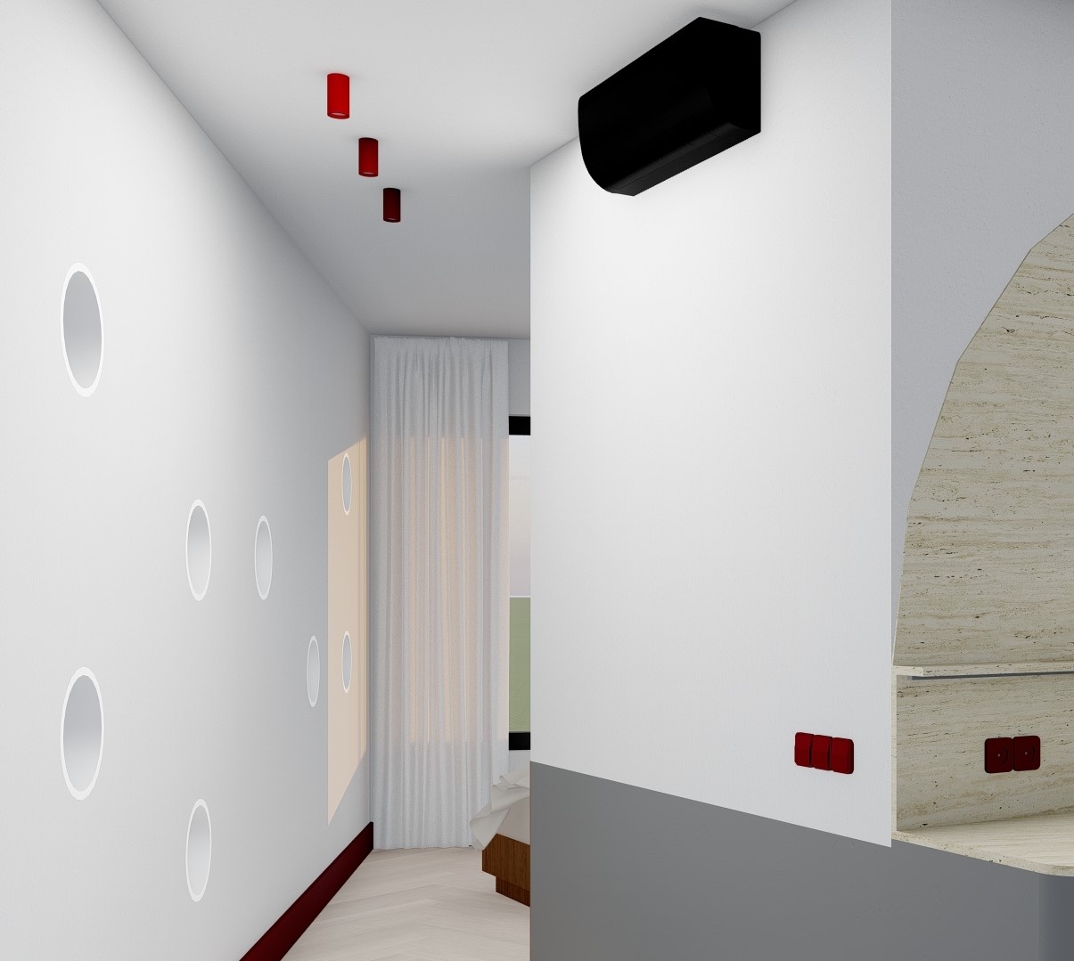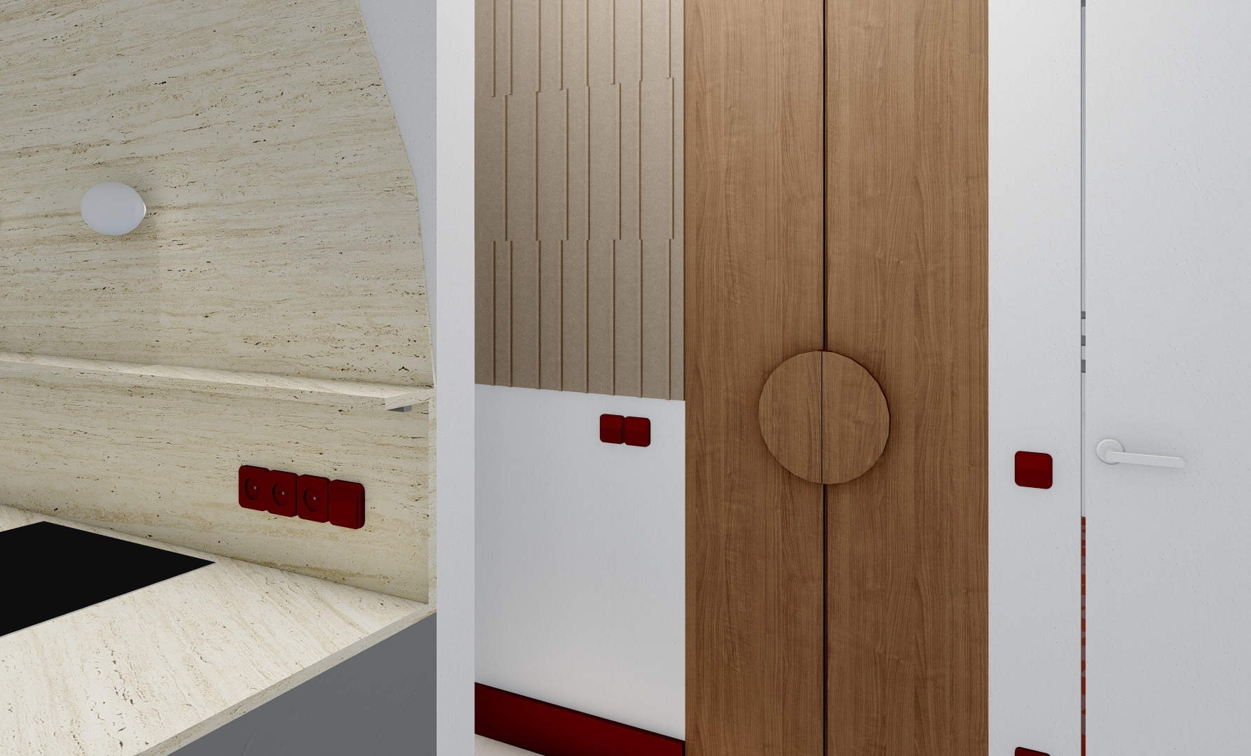 JUNG. Mažiesiems projekto akcentams buvo pasirinkti JUNG kištukiniai lizdai ir jungikliai. Jungikliųmodelis – CD serijos raudonos spalvos, kištukiniai lizdai – Schuko® serijos. Tiek jungikliai, tiek lizdaiyra tamsiai raudonos spalvos, kuri minimalistiniame interjere suteikia charakterio, šilumos ir, svarbiausia, ilgainiui išlaiko estetinį vaizdą be dažnos priežiūros.