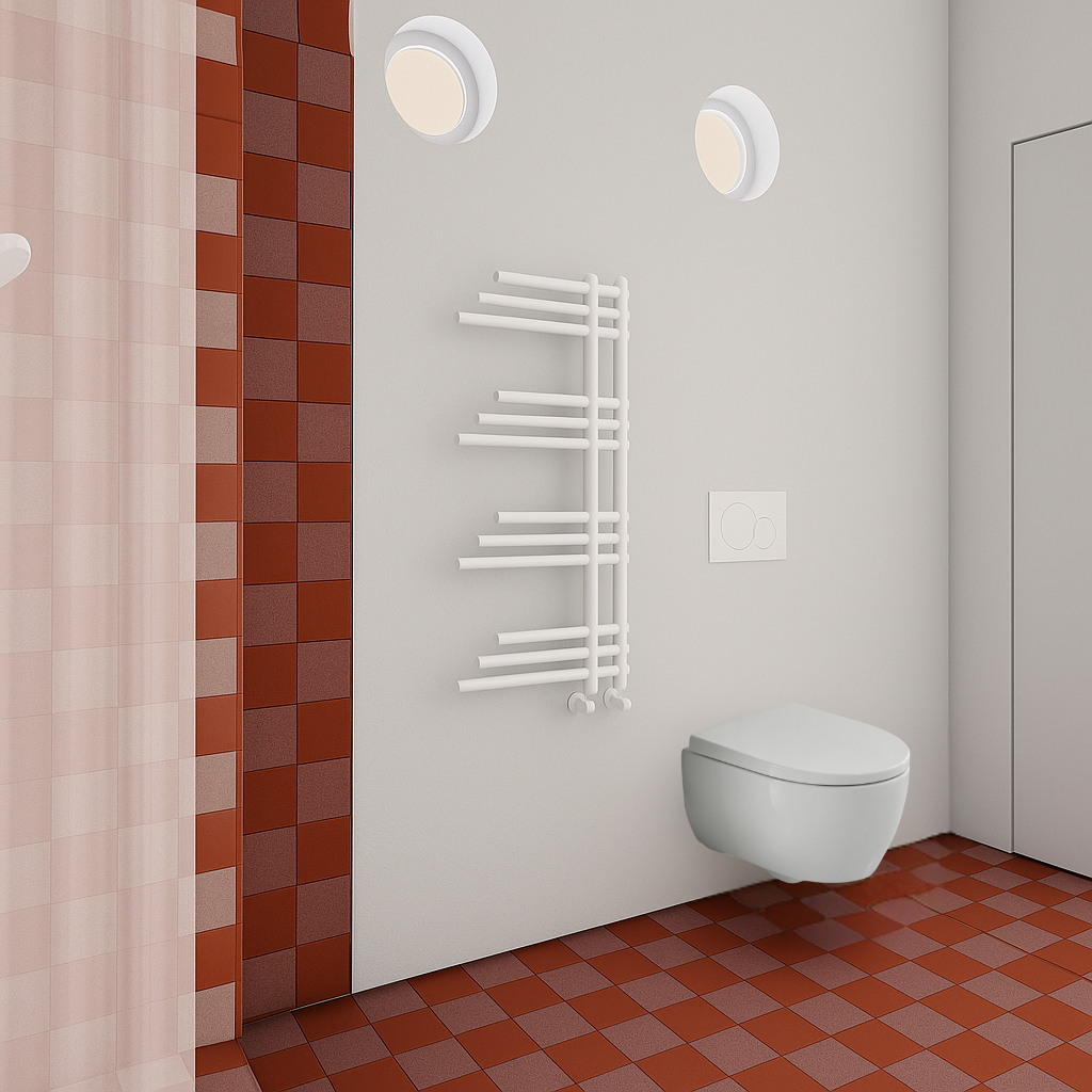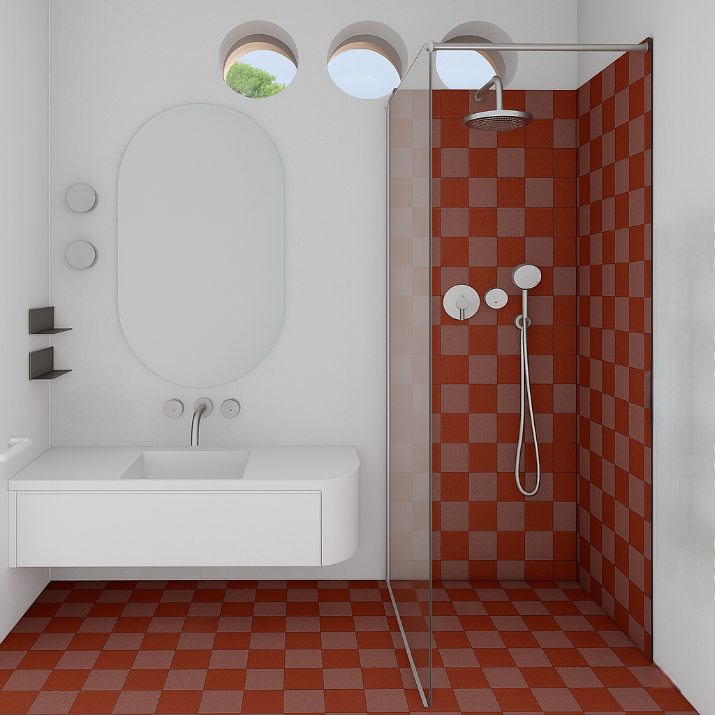 GEBERIT. Vonios patalpoje pasirinktas Geberit iCon Compact pakabinamas WC puodas. Šis WC puodas yra kompaktiško ilgio – tai reiškia, kad ši vonios kambario detalė bus vizualiai lengvesnė, beinužims mažiau erdvės. Taip pat WC puodas išsiskiria TurboFlush vandens nuleidimo technologija, kuriužtikrina ypač tylų bei efektyvų WC puodo nuplovimą su mažesniu vandens kiekiu, nei įprasti WC puodai. Vandens nuleidimo mygtukas naudojamas Sigma01.
