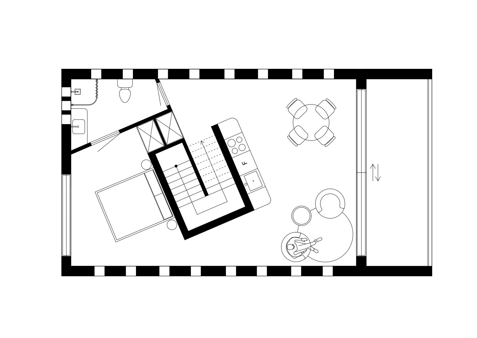 Erdvės išplanavimas buvo kruopščiai apgalvotas, kiekvienas kvadratinis metras išnaudojamas ir nelieka be funkcijos. Patekus į namą, matome identiškas, standartiniui namui būdingas erdves– pirmiausia patekus į vidų mus pasitinka laiptinėkuri veda į koridorių su drabužine, kairėje ranka pasiekiamos vonios kambario durimis. Toliau atsiveria virtuvė su vaizdu į gamtą, pereinanti į valgomąjį bei poilsio zoną. Centrinė namo ašis– laiptinė, patalpoje formuoja praėjimą į miegamojoerdvę. Čia suprojektuota plati dvigulė lova, drabužinė bei antras įėjimas į vonios kambarį. Namo išdėstymas sukurianatūralų judėjimo ratą – kiekviena erdvė sklandžiai pereina į kitą.