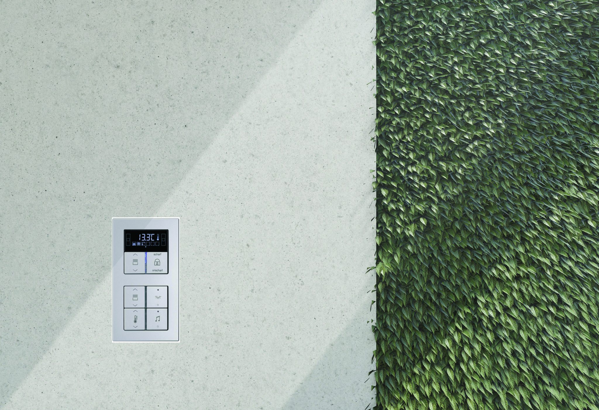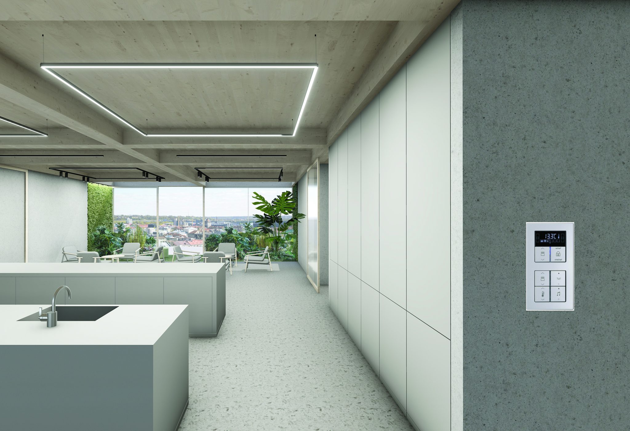 JUNG. Išmanioji KNX automatizavimo sistema visas funkcijas (apšvietimą, multimedijas, šildymą, vėsinimą, vėdinimą ir kt.) sujungia į bendrą tinklą ir valdo centralizuotai. Į sieną įmontuojami ir idealiai lygią plokštumą su ja sudarantys „LS Zero“ linijos jungikliai suteikia visam interjerui išgrynintos detalių estetikos.