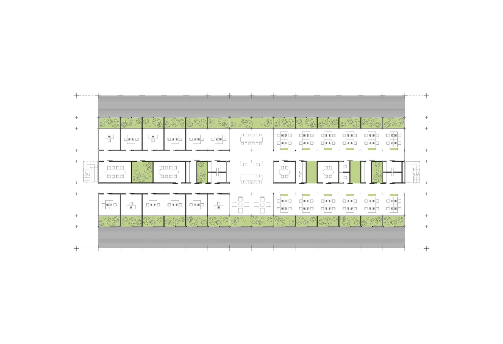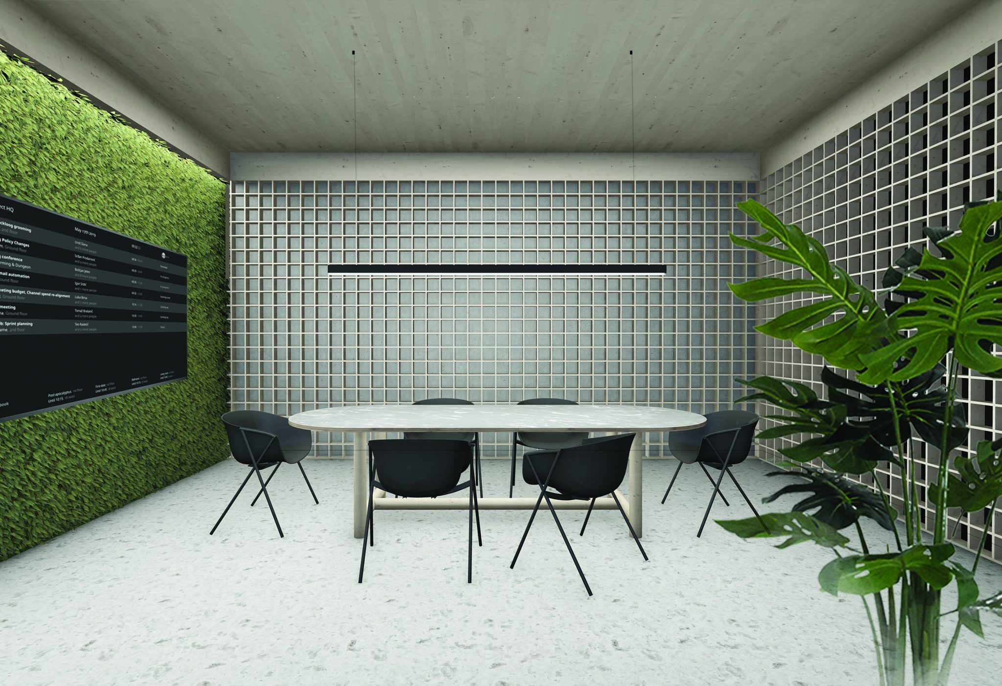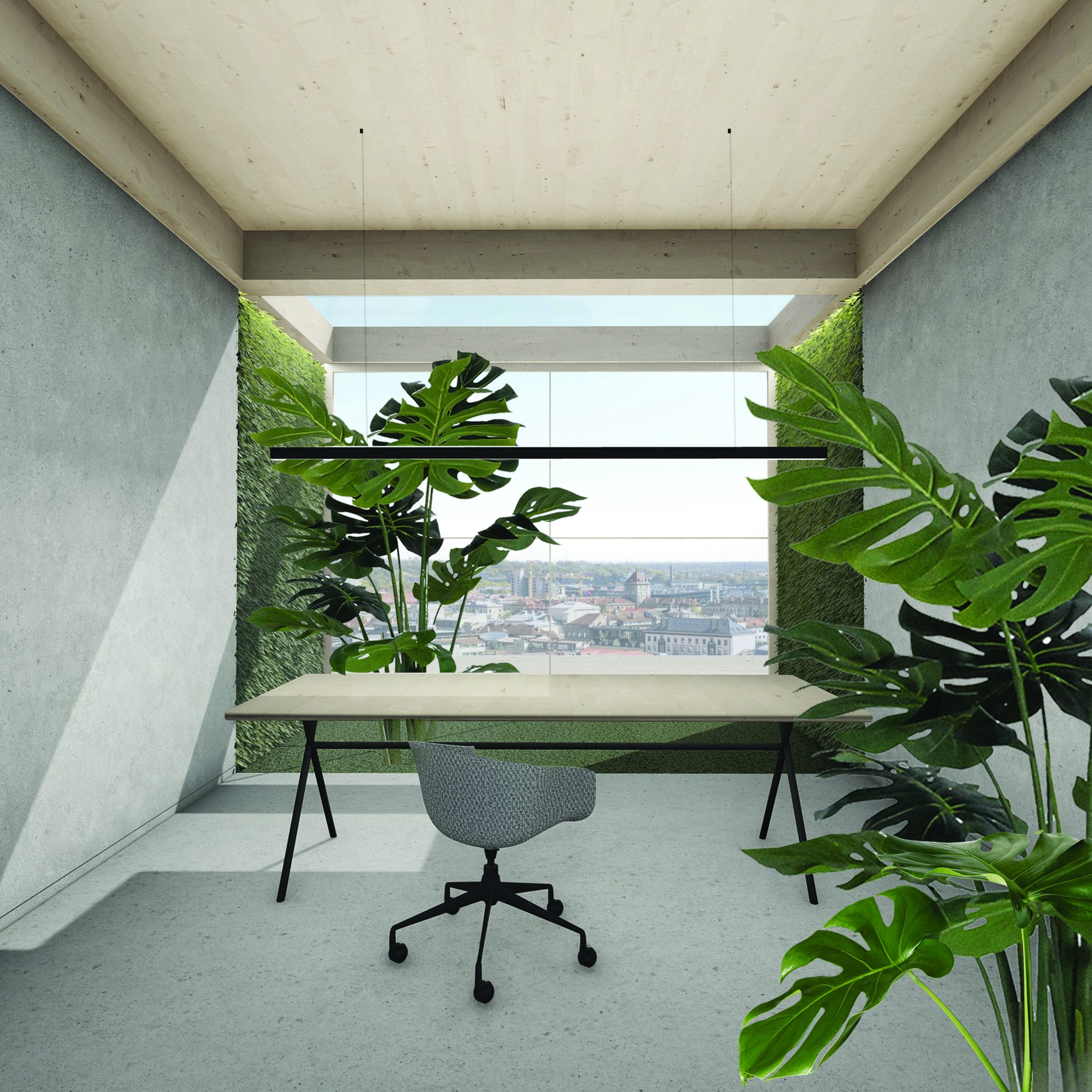 This coworking space is dedicated to natural recharge, recreation, and relaxation. We are used to work in artificial spaces the whole week and relax in nature only after work or on weekends. However, a working place could also be set up “in nature”, thus the concept focuses on greenery, vegetation, and open rooftop terraces. The idea of coworking space is based on Shinrin-Yoku, a forest bathing in Japanese. It’s a mindful being in nature which recharges all vital systems, relaxes, soothes, concentrates the mind, and removes tension. All the senses, seeing, color, smell, sound, touch are important here, therefore all the spaces are full with vegetation.