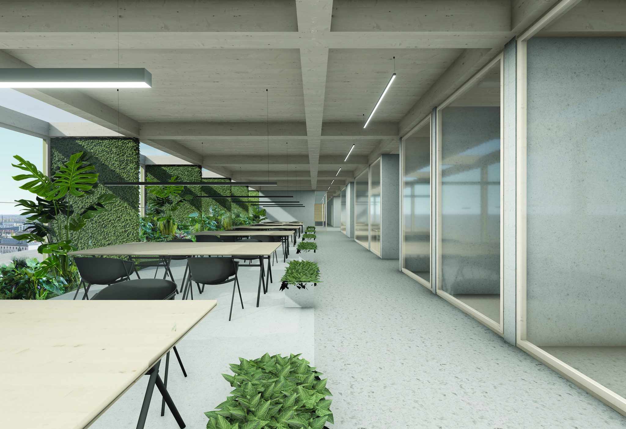 Interjeras kuriamas minimalistinis ir asketiškas, neapkraunantis minčių – leidžiama veikti gamtai. Dominuoja šviesūs atspalviai, betonas ir medis. Bendradarbystės erdvė kuriama ir uždara, ir atvira – formuojamos individualios kūrybinės studijos, taip pat atviros darbo erdvės.