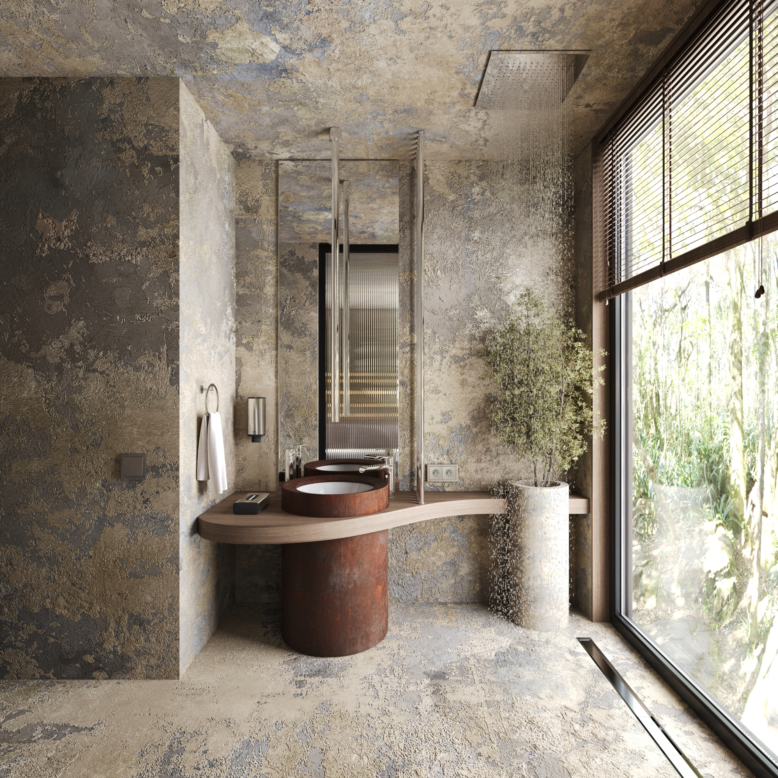 RUBINETA. Masažo kambario dušo zonoje naudojama RUBINETA Rainfall + Cosythermo-10 SW termostatinė dušo sistema, užtikrinanti komfortą, funkcionalumą ir estetiškai vientisą sprendimą. Juodos spalvos lietaus dušo galvos apačia ir rankinės dušo galvutės priekinė dalis su šviesiais purkštukais suteikia modernų, premium pojūtį. Termostatinis maišytuvas leidžia tiksliai palaikyti vandens temperatūrą, užtikrina saugumą ir patogų naudojimą. Plati lietaus dušo galva kuria malonų SPA efektą.