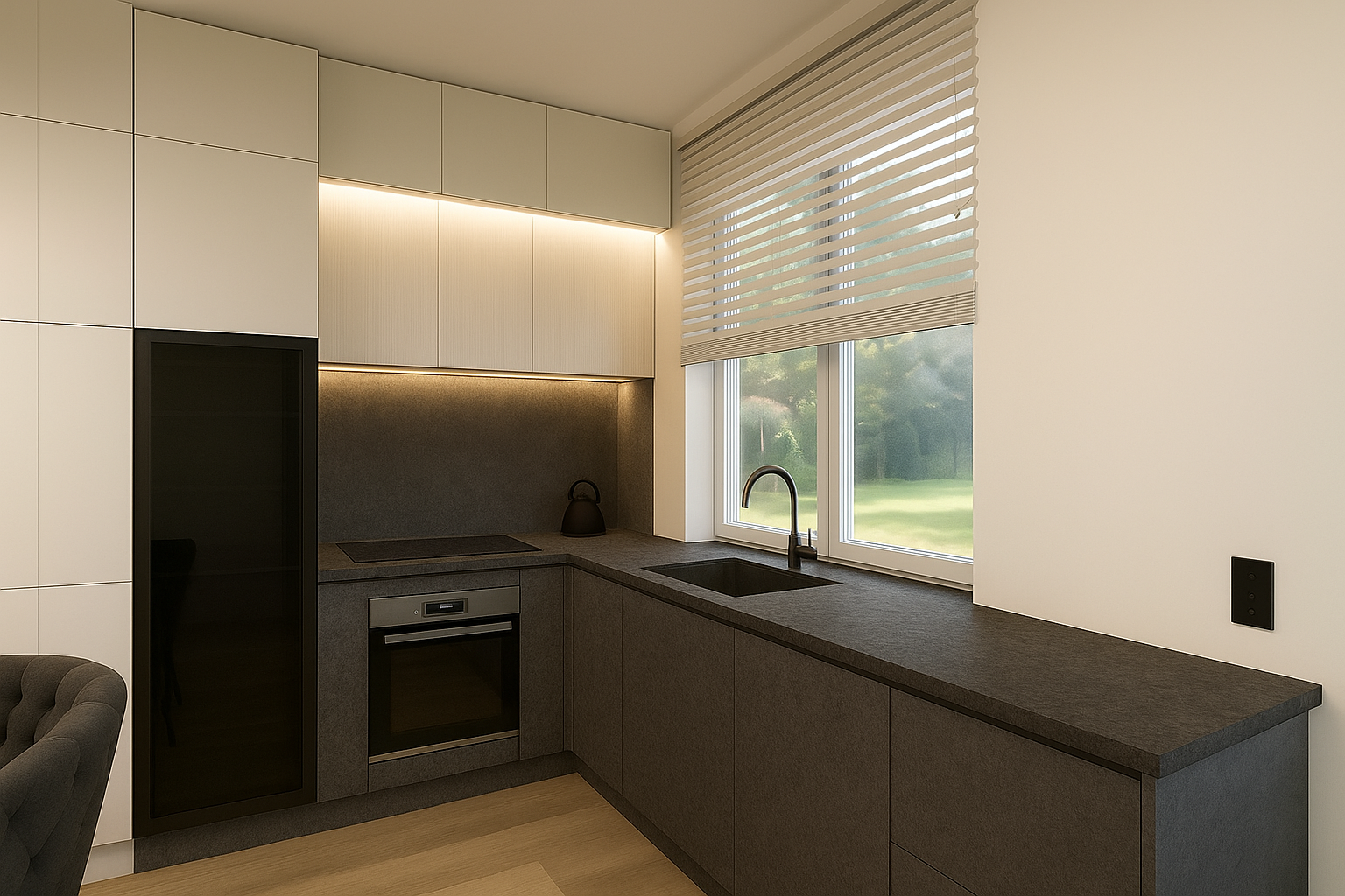 BRASA. Virtuvėje panaudoti šiuolaikiniai apšvietimo sprendimai su integruota „Häfele Connect Mesh“ sistema, suteikiančia galimybę valdyti ryškumą, spalvinę temperatūrą bei kurti individualiusscenarijus pagal poreikį.