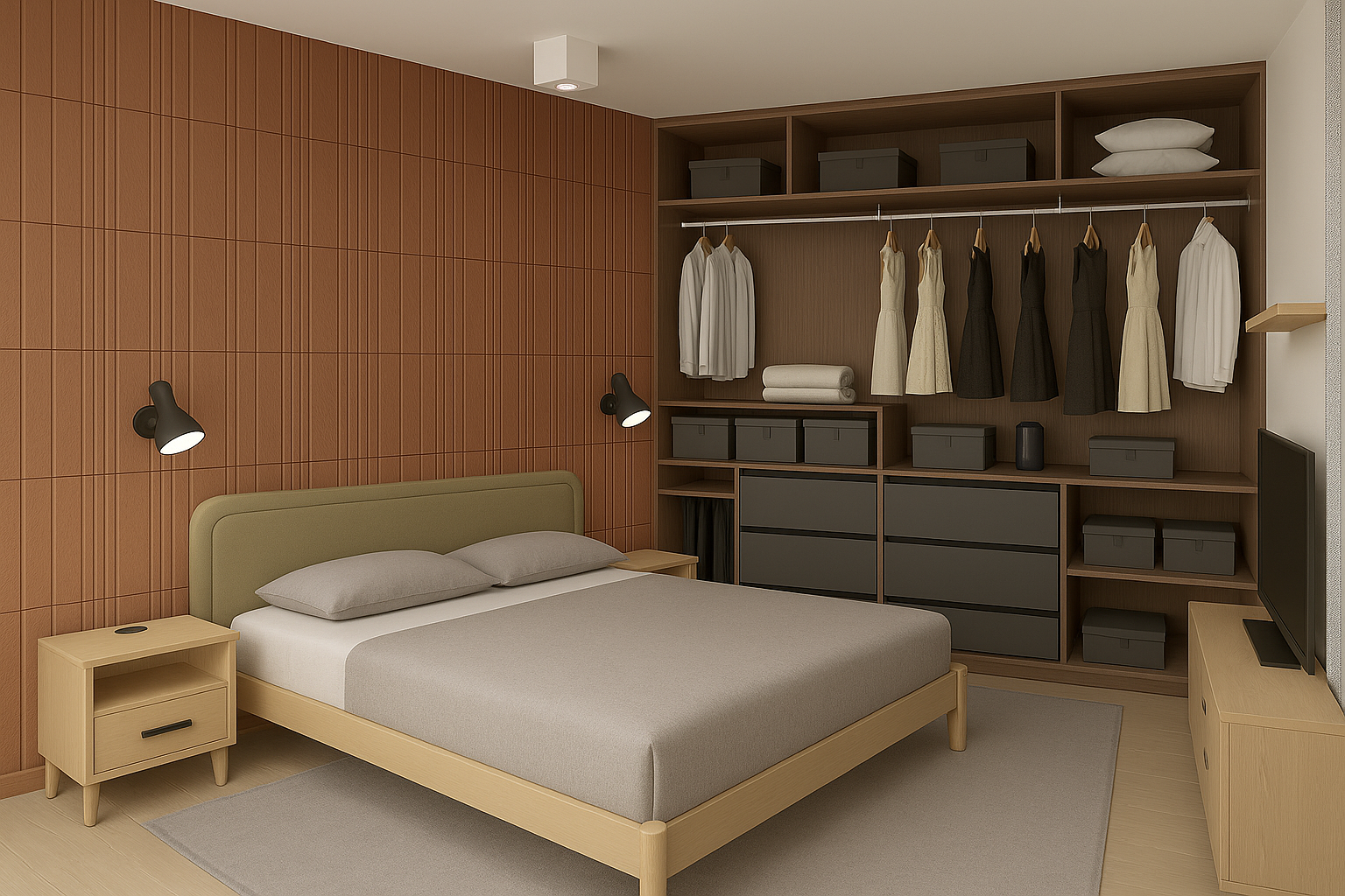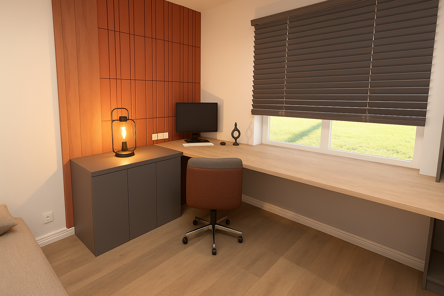 WAYNERR – sienų apdailos sprendimai. Miegamojo ir darbo kambariuose pritaikytos Balance kolekcijos „Mocha Gaze“ akustinės plokštės. Jos ne tik suteikia interjerui estetikos, bet ir ženkliaipagerina garso izoliaciją bei akustinį komfortą, užtikrindamos tylą ir ramybę kasdienėje aplinkoje.