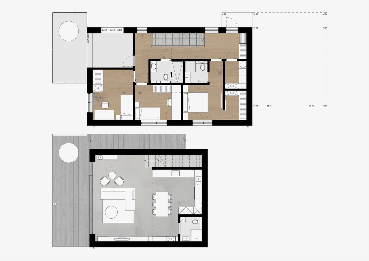 Namai ant šlaito su pusrūsiu turi privalumų dėl puikios panoramos ir gyvenamųjų zonų paskirstymo dviem lygiais – aktyvaus ir pasyvaus poilsio. Taip pat, neturint didelio užstatymo ploto, galima turėti didelį gyvenamąjį plotą. Pusrūsyje įrengta erdvi svetainė su virtuve ir vonios kambariu bei terasa, o pirmajame aukšte yra trys miegamieji, du vonios kambariai, drabužinė, katilinė ir terasa su balkonu.
