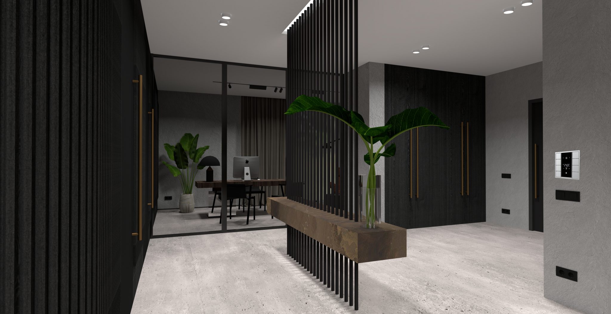 JUNG. Prie įėjimo integruota gamintojo „Jung“ telefonspynės vidaus stotelė LS 990 suteikia galimybę matyti apsilankantį svečią. Visų namų kontrolei pasirinkta sistema „Jung KNX“ užtikrina patogumą, saugumą ir ekonomiškumą. Pastato apšvietimo, šildymo, vėdinimo, kondicionavimo, saugos, užuolaidų ir garso sistemas sujungia į vieną KNX protingo namo sistemą, tad taip taupoma pastato energija. Visame interjere naudojami „Jung“ metaliniai LS 990 (antracito spalvos) serijos jungikliai ir kištukiniai lizdai, išsiskiriantys patogumu, estetika ir galimybe į vieną jungtuko rėmelį sudėti daug valdymo mygtukų. Kištukiniai lizdai parinkti su apsauga nuo vaikų, nes saugumas – taip pat svarbi namų detalė.