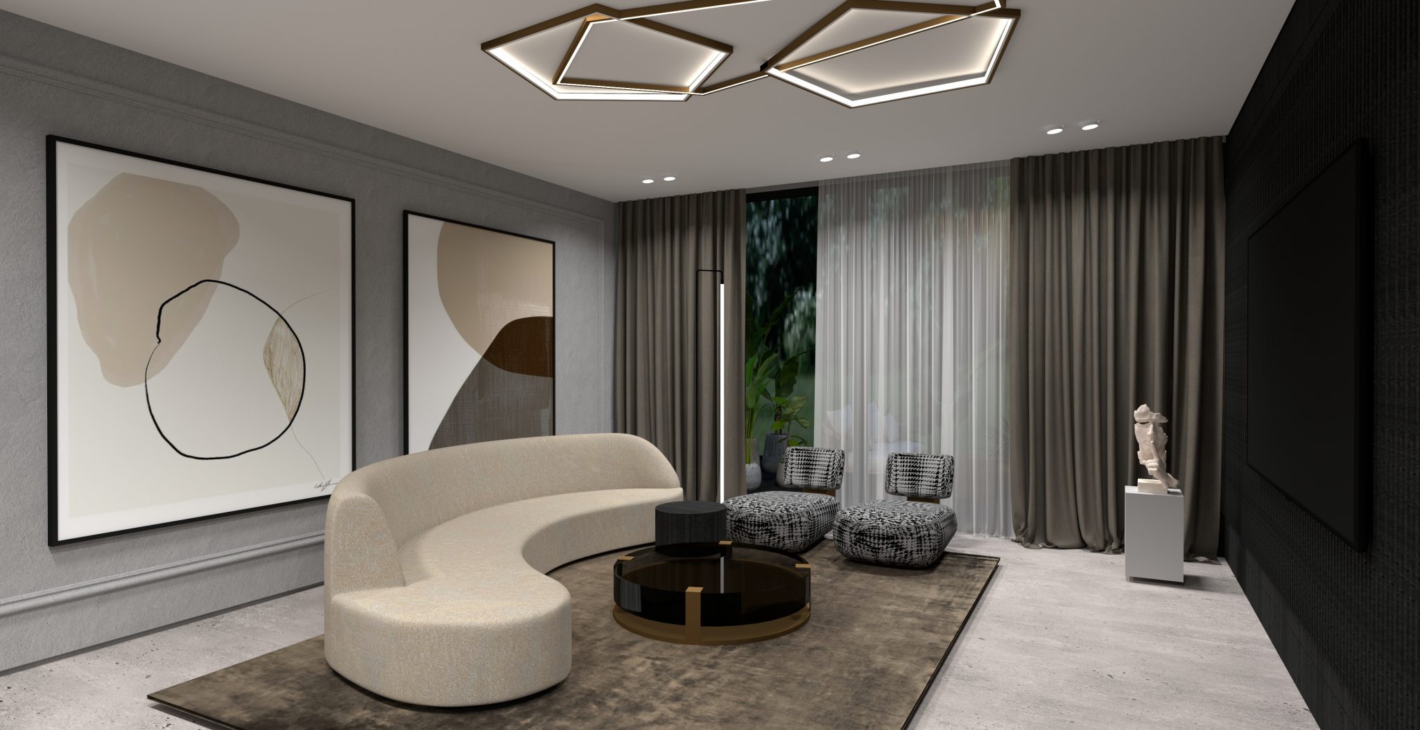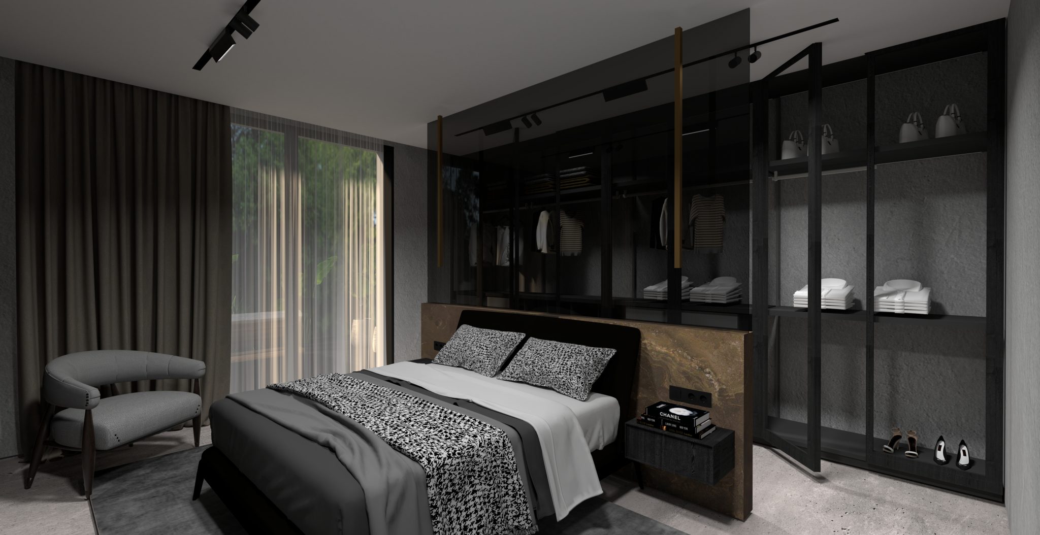 INTERJERO LINIJA. Interjerui kurti naudojamos tik aukščiausios kokybės naktinės ir dieninės užuolaidos, kurios atitinka visus priešgaisrinius reikalavimus. Naktinių užuolaidų audinys „Bedra“ (8059.15), dieninių – „Marmara“ (8025.11). Interjere pritaikomos betono imitacijos plytelės „Amtico“ iš serijos „Tempus Embrace“. Jos klijuojamos visame name, norint išlaikyti vientisumą.