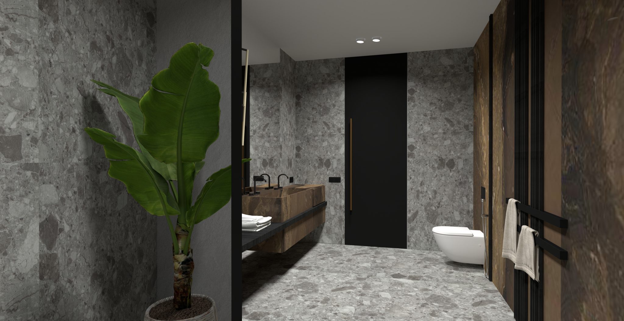 GEBERIT. Vonios kambario vienas svarbiausiu elementų yra unitazas, tačiau, norint, kad jis negadintų bendro minimalistinio ir estetiško dizaino, buvo pasirinktas itin kokybiškas unitazas iš serijos „Geberit Acanto“. Prie jo priderintas potinkinis bakelis „Geberit Sigma“ ir sulig sienos paviršiumi montuojamos vandens nuleidimo mygtukas „Geberit Sigma70“, todėl nesutrikdo dizaino harmonijos.