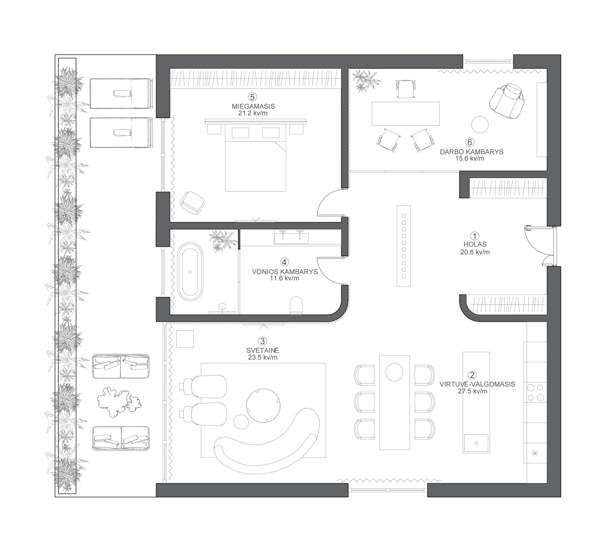 VALVĖSTA. Terasos grindims pasirinkta patvari natūralaus medžio rašto („Burnt Cedar“) serijos „Millboard“ grindų danga. Ši spalva drąsi, elegantiška ir pulsuoja šiluma.