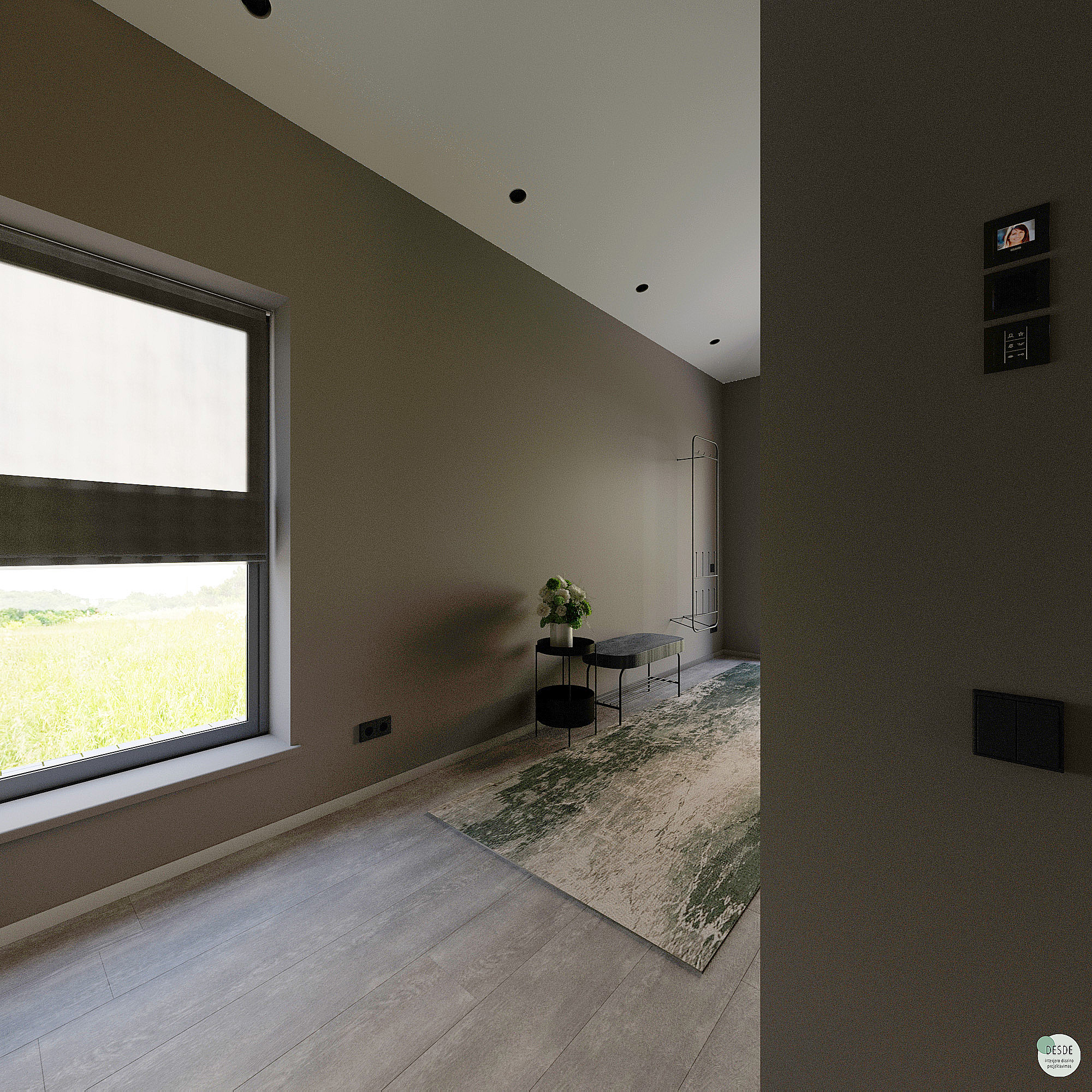 INTERJERO LINIJA. Atsižvelgiant į jaukumo ir praktiškumo poreikį, visame name naudojamos vinilinės grindys. „Interjero linija“ atstovauja vinilinių dizaino grindų gamintojui „Amtico International“. Dėl specialios sudėties šios grindys sunkiai atskiriamos nuo natūralių, tačiau yra labai atsparios dėvėjimuisi ir ilgalaikės. Kolekcijos „Amtico Carpet“ plytelės panaudotos drabužinėje. Tikslas – ne tik estetiškumas, bet ir praktiškumas, kad dulkės netvyrotų ore.