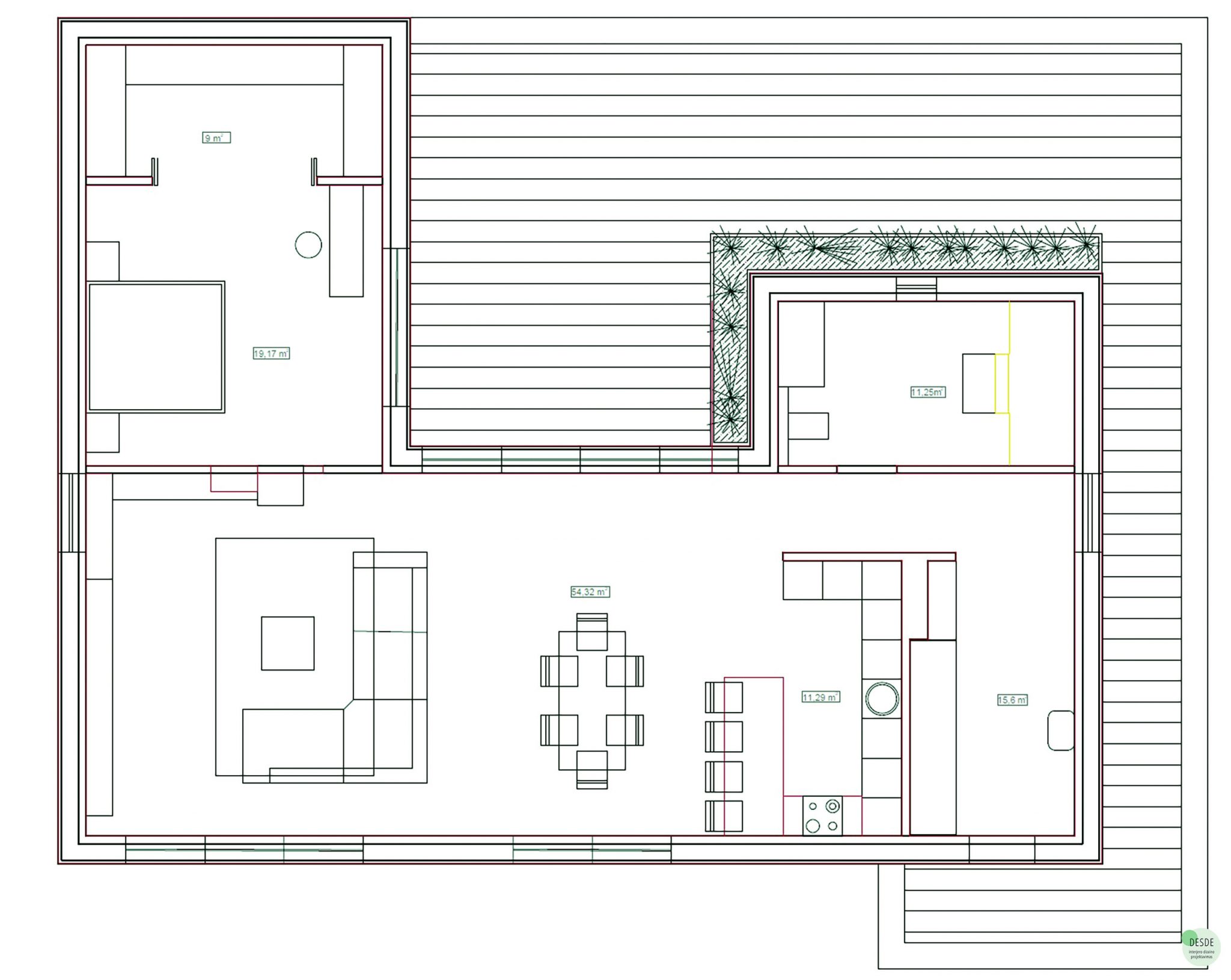 VALVĖSTA. Pasirinktos terasinės lentos „Millboard“, gaminamos iš lygios medienos. Natūrali spalvų gama puikiai atkuria subtilius niuansus, kuriuos gali suteikti tik natūrali mediena. Lentos išsiskiria tvirtumu ir yra visiškai neslidžios. Į terasą galima patekti ir iš svetainės bei valgomojo zonos, ir iš miegamojo.