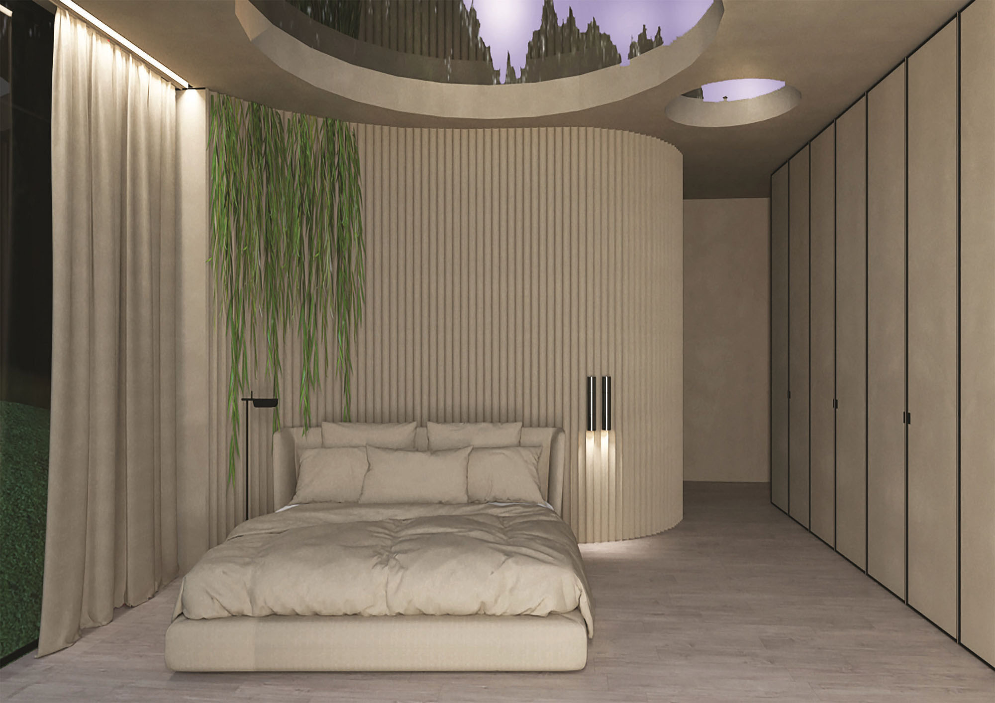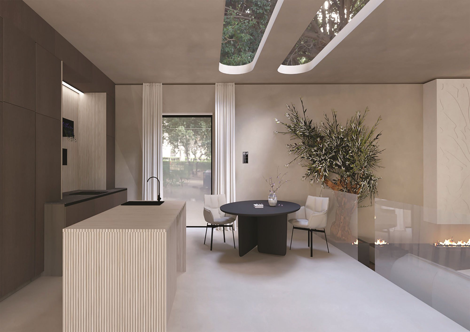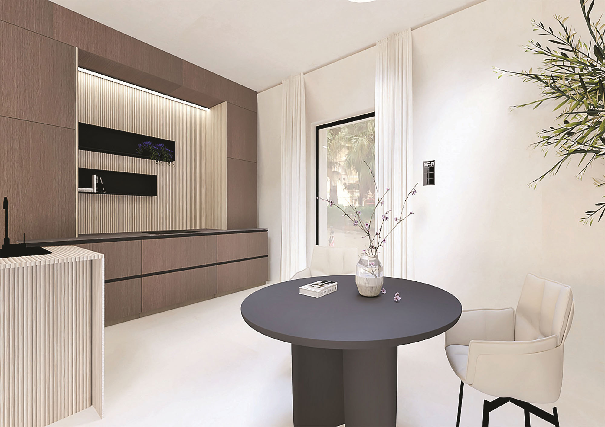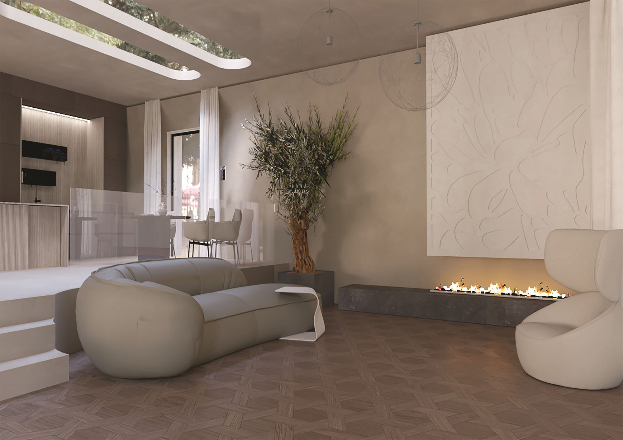 RENVERSA. Ypatingam interjerui reikia stilingų bei kokybiškų medžiagų, todėl jos parinktos iš patikimų, ypatingu dizainu išsiskiriančių gamintojų. Audinių spalvos ir tekstūra išsiskiria lakoniškumu, puikiai sušvelnina minimalistinio interjero griežtumą. Audiniai lengvai prižiūrimi ir plaunami, o elektroninis užuolaidų valdymas įdiegtas į išmaniojo namo sistemą.