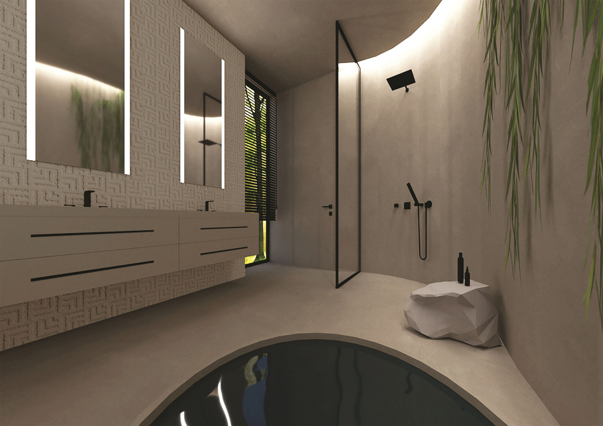 KAMĖ. Sanitarinis mazgas primena prabangaus SPA kambarį. Lakoniško ir unikalaus dizaino, kuriam puikiai priderinti minimalistiniai praustuvai su spintelėmis ir dušo sienelė. Kokybiškos medžiagos, švarios formos ir lengva priežiūra – viskas, ko reikia vonios kambario erdvėje.