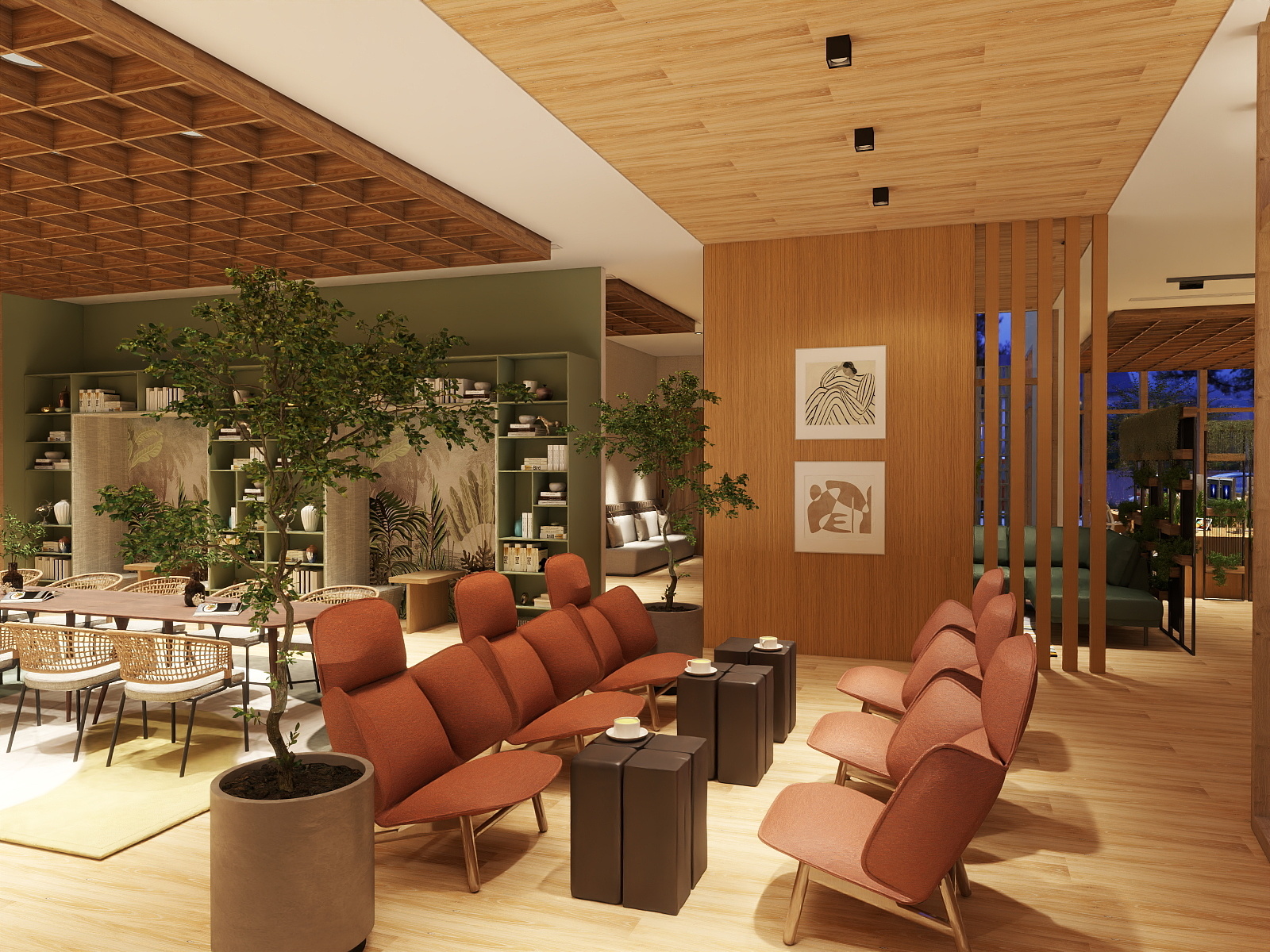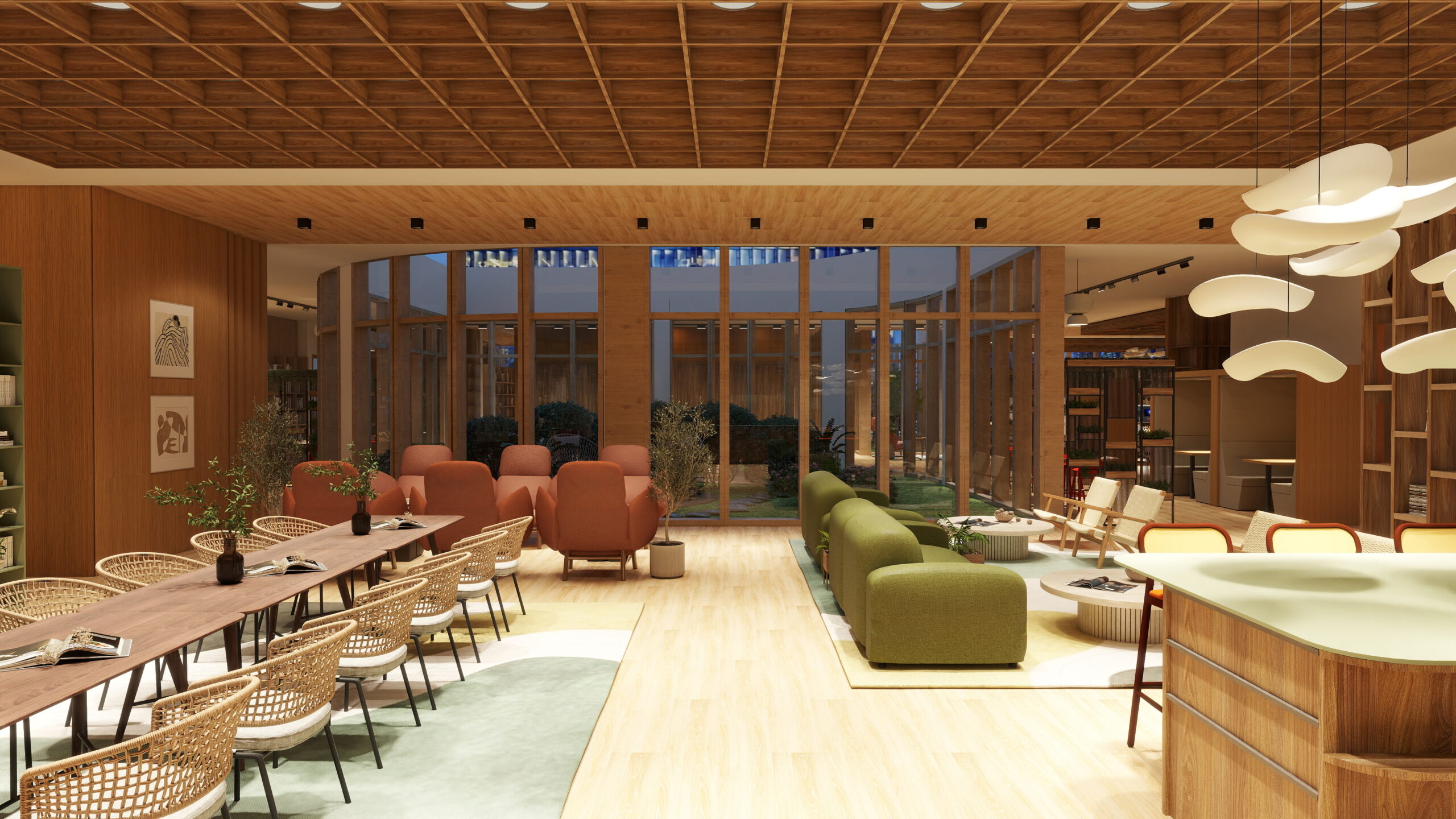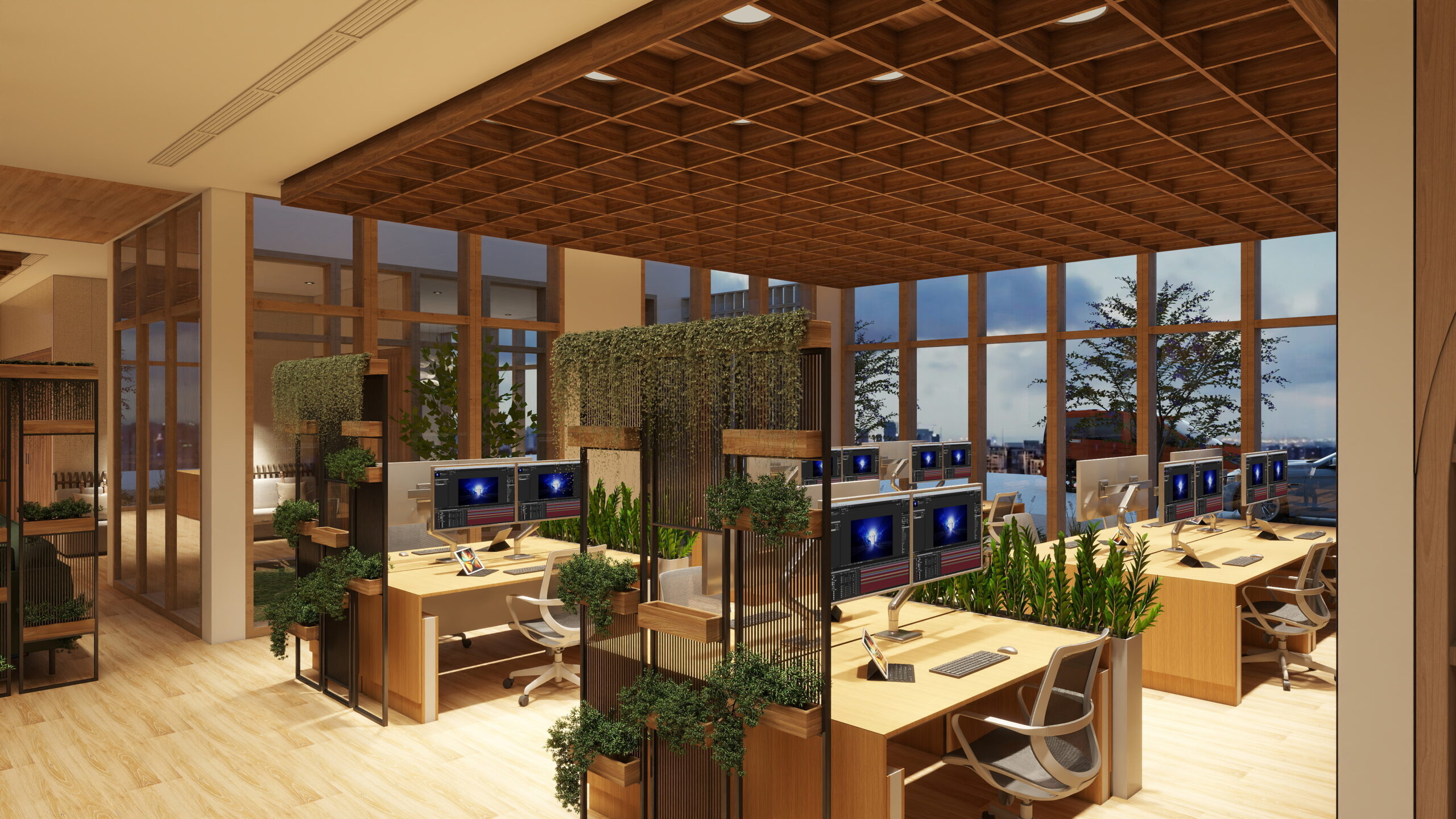 BIOSYNCORA. Norėdami suteikti biuro erdvėms natūralumo ir gerinti darbuotojų savijautą interjere naudojome gyvus augalus iš „Biosyncora“. Jie buvo sodinami į vazonus, kruopščiai priderintus prie interjero, taip pat buvo apželdintos lauko erdvės, sukurtas harmoningas vidaus ir išorės ryšys. Šie sprendimai padeda gerinti oro kokybę, mažinti stresą ir didinti produktyvumą. Tai tvarus ir elegantiškas pasirinkimas šiuolaikiniam biurui, kuriame vertinama gamtos svarba.