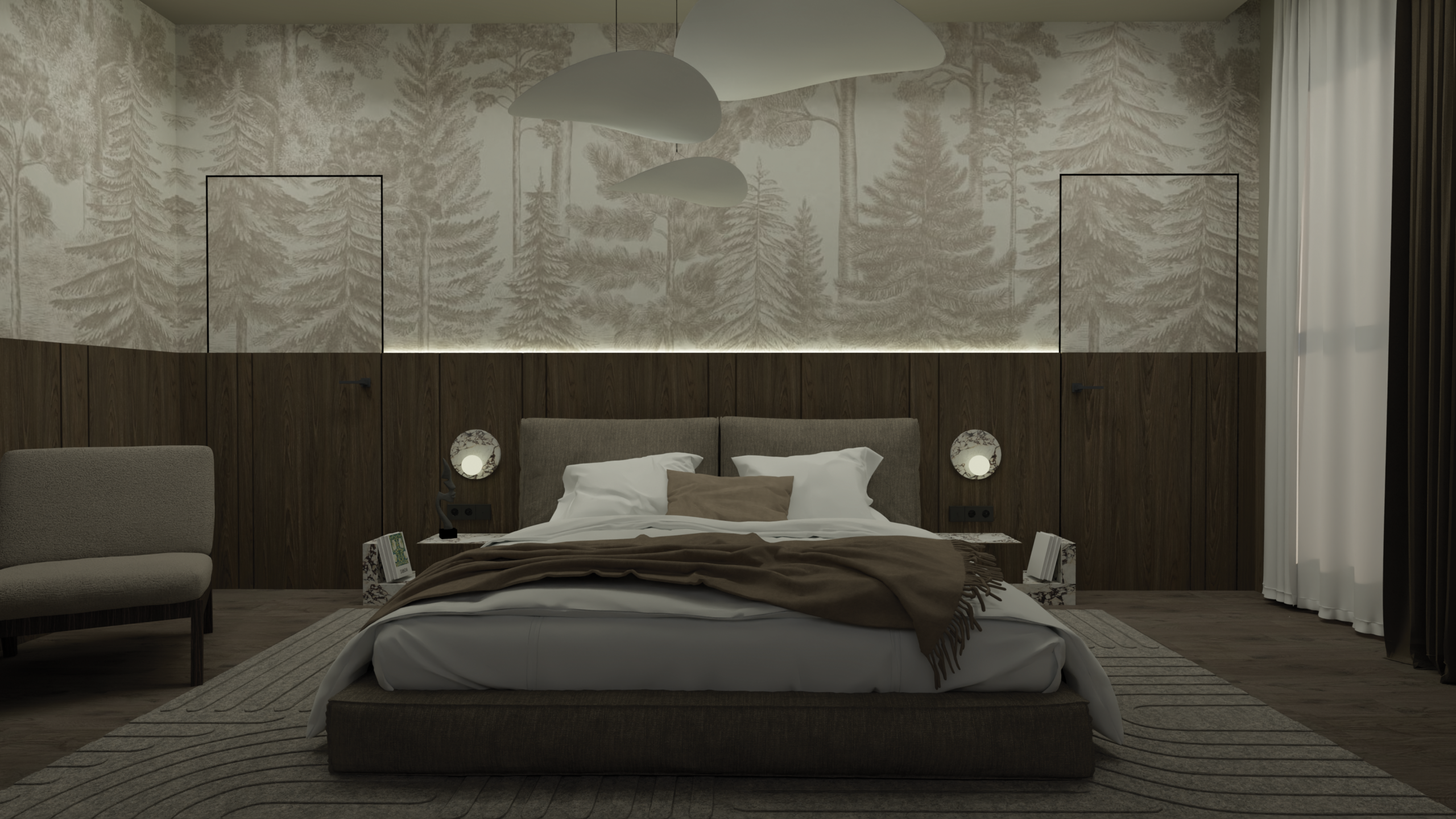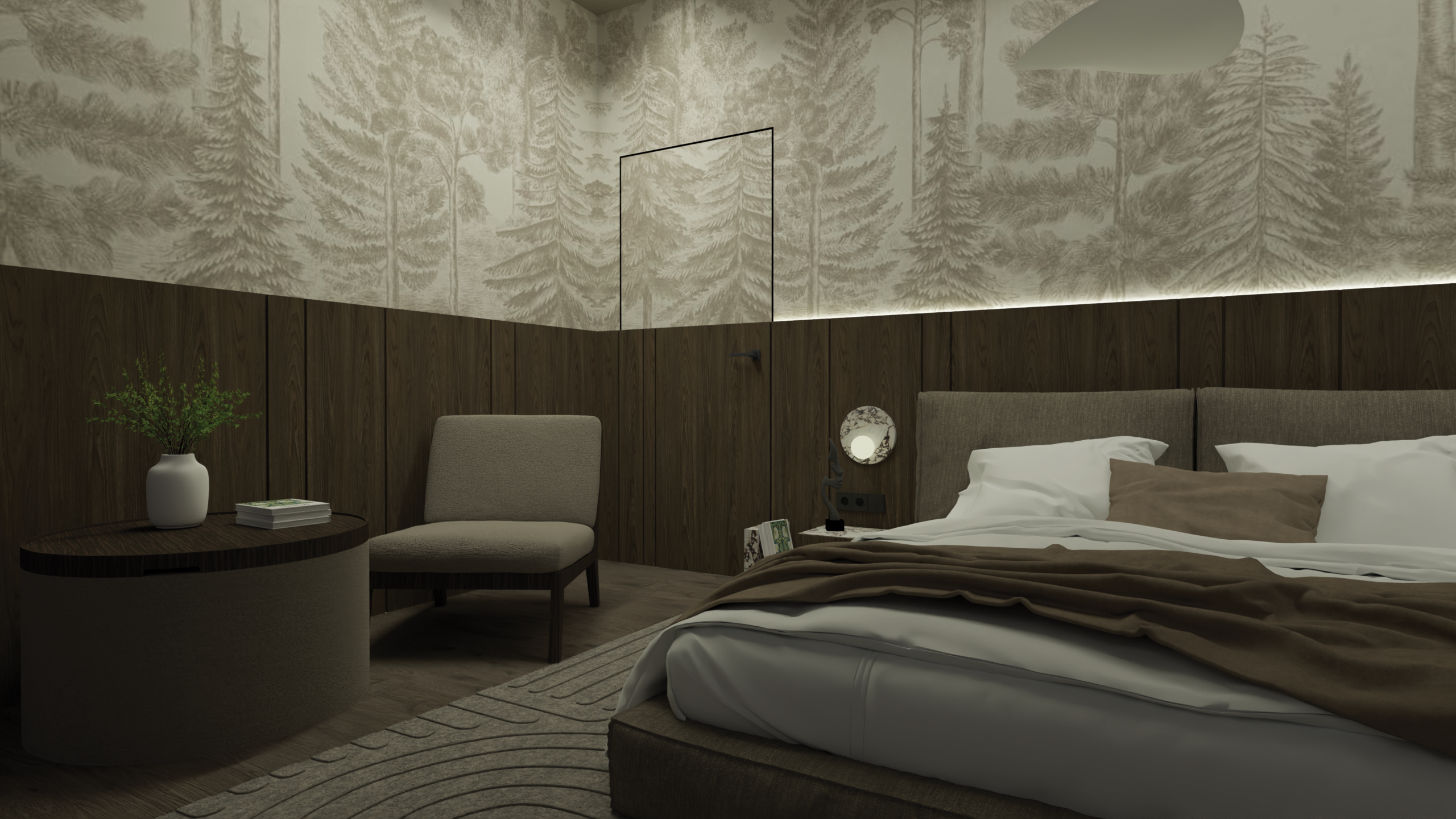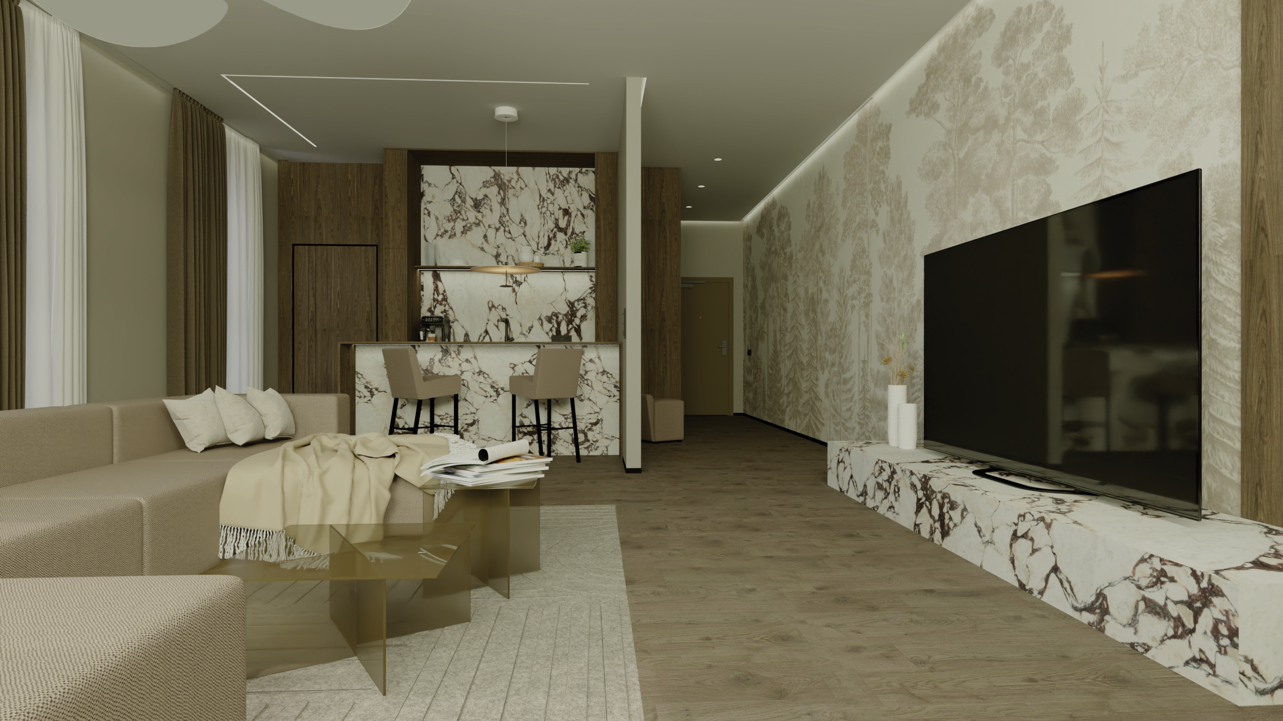 Šis interjeras sukurtas kaip ramybės ir natūralaus prabangumo oazė, kurioje gamtos įkvėptos faktūros susilieja su moderniomis, švariomis linijomis. Švelnūs žemiški tonai, organiški raštai ir akmens paviršiai formuoja harmoningą, raminančią atmosferą. Subtilus apšvietimas pabrėžia medžiagų gylį ir eleganciją, o apgalvoti akcentai kuria vientisą, išskirtinai jaukų charakterį. Tai projektas, kuriame estetika ir komfortas susijungia į darnią, prabangiai santūrią visumą.
