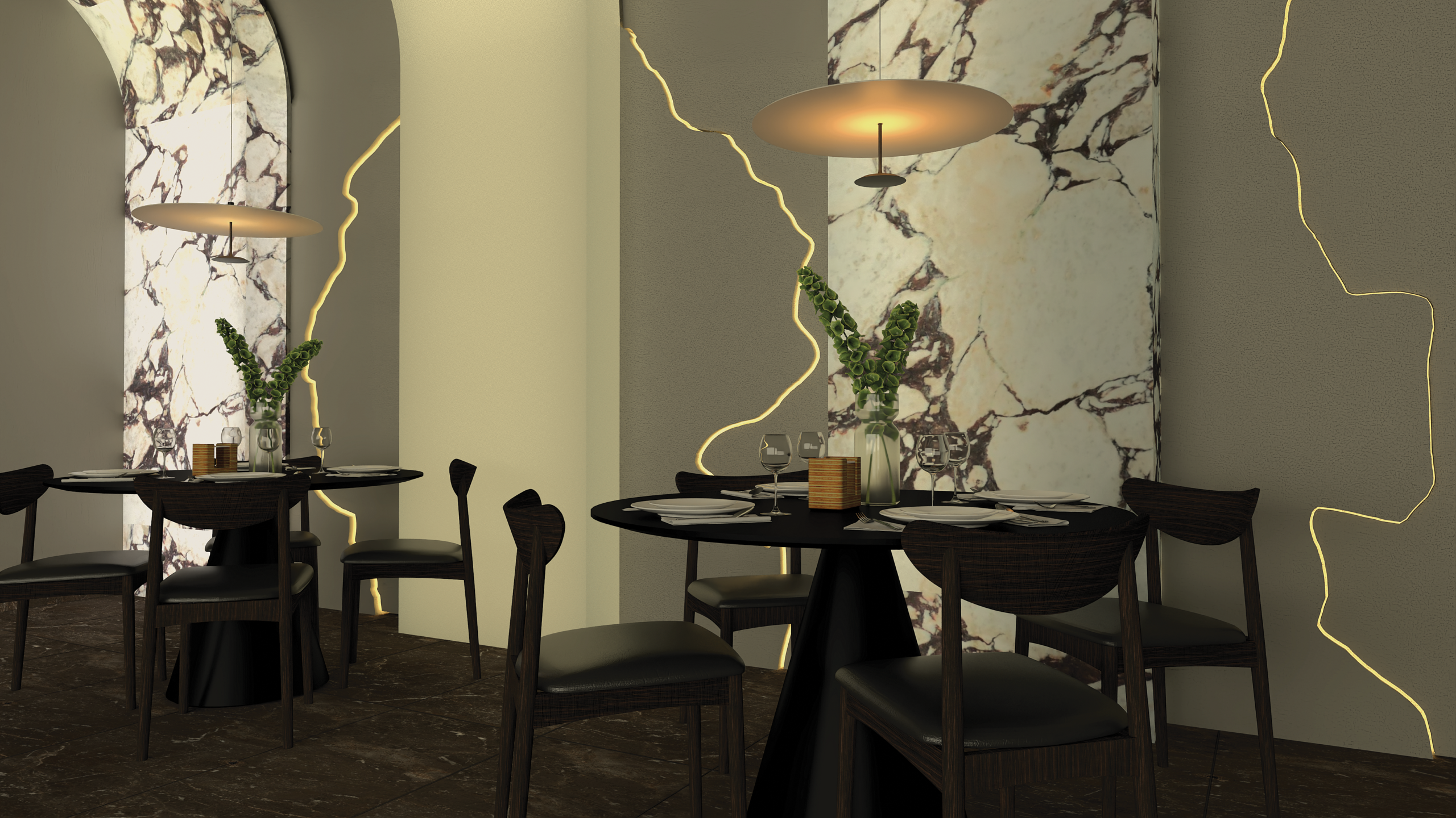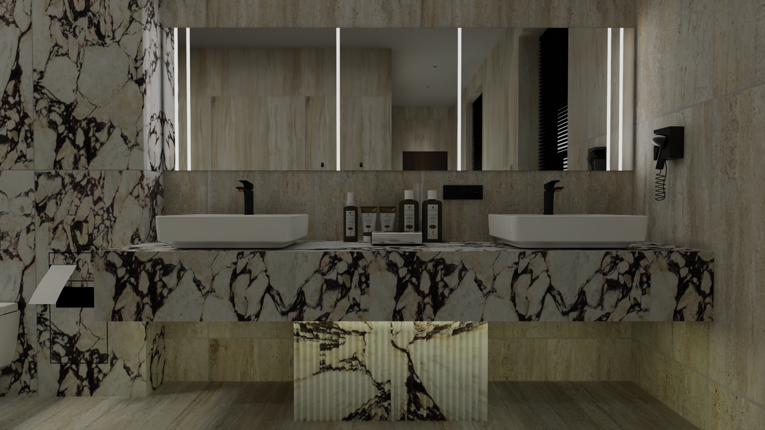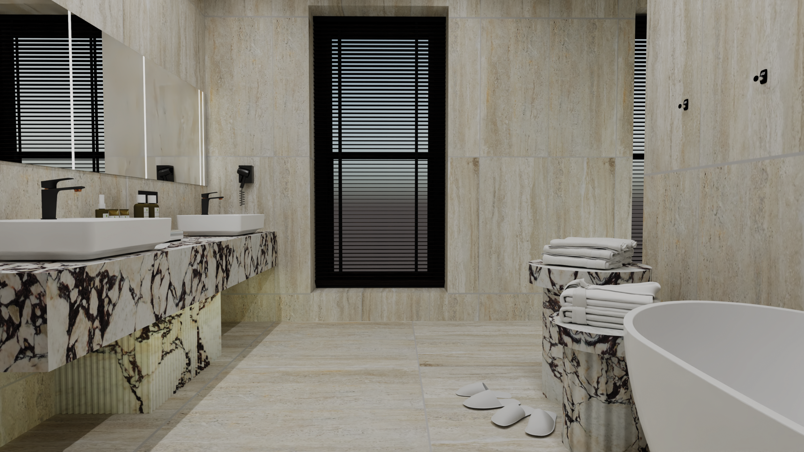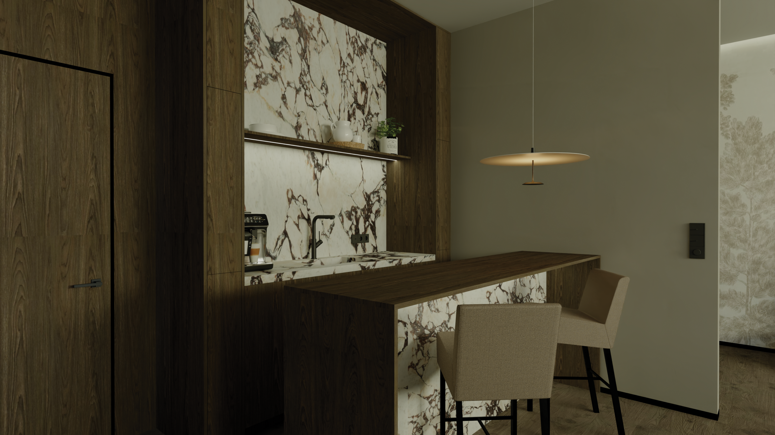 Šis interjeras sukurtas kaip ramybės ir natūralaus prabangumo oazė, kurioje gamtos įkvėptos faktūros susilieja su moderniomis, švariomis linijomis. Švelnūs žemiški tonai, organiški raštai ir akmens paviršiai formuoja harmoningą, raminančią atmosferą. Subtilus apšvietimas pabrėžia medžiagų gylį ir eleganciją, o apgalvoti akcentai kuria vientisą, išskirtinai jaukų charakterį. Tai projektas, kuriame estetika ir komfortas susijungia į darnią, prabangiai santūrią visumą.
