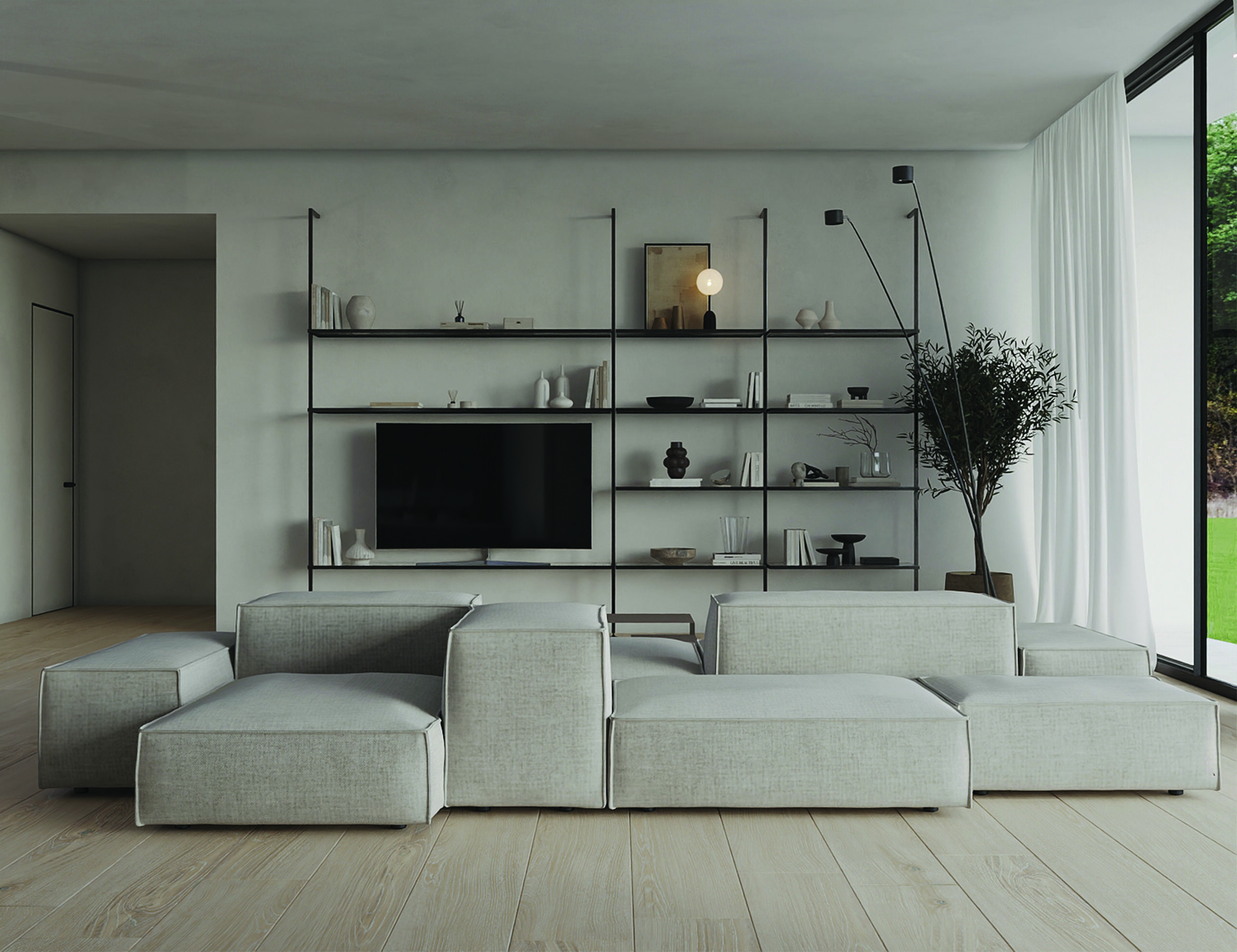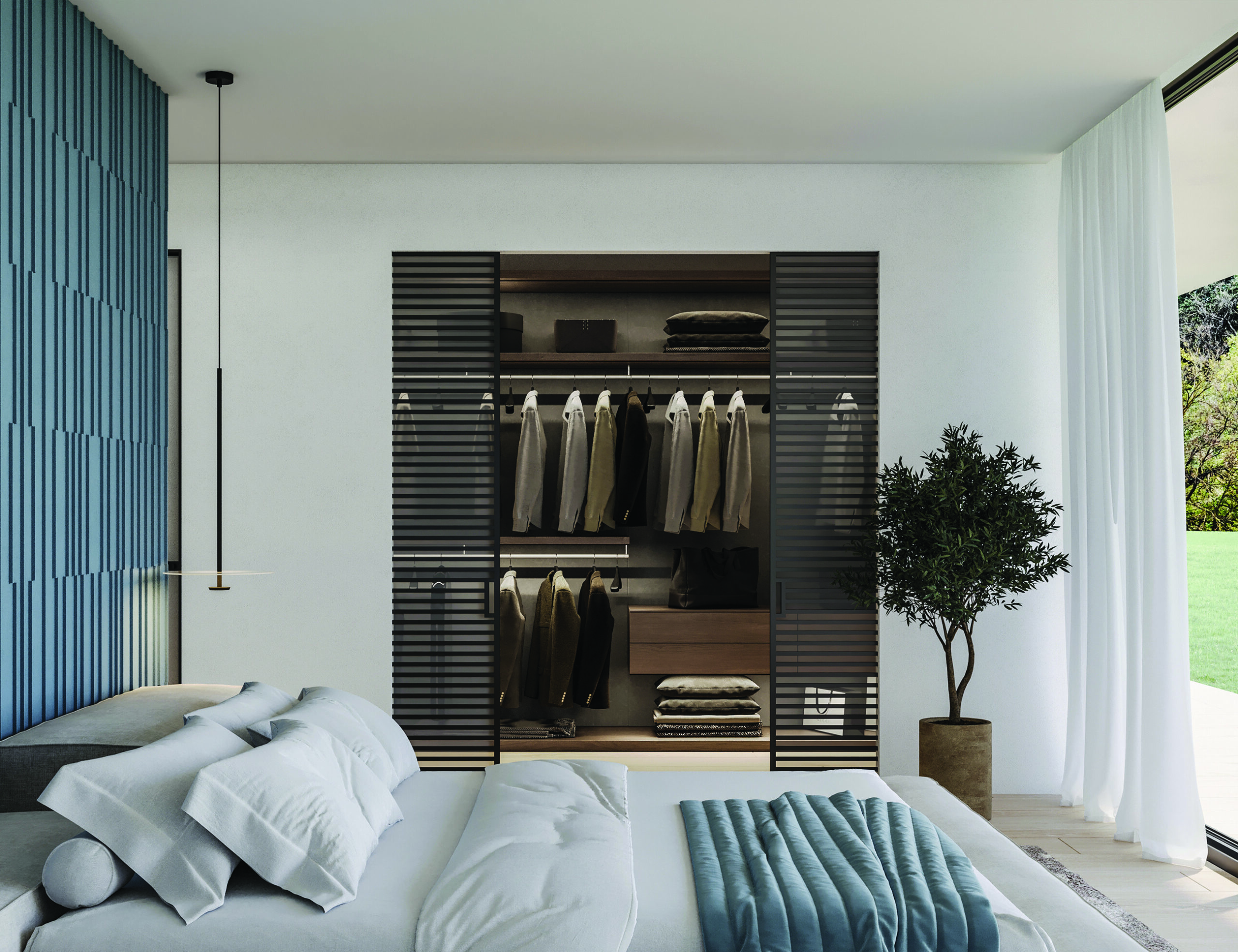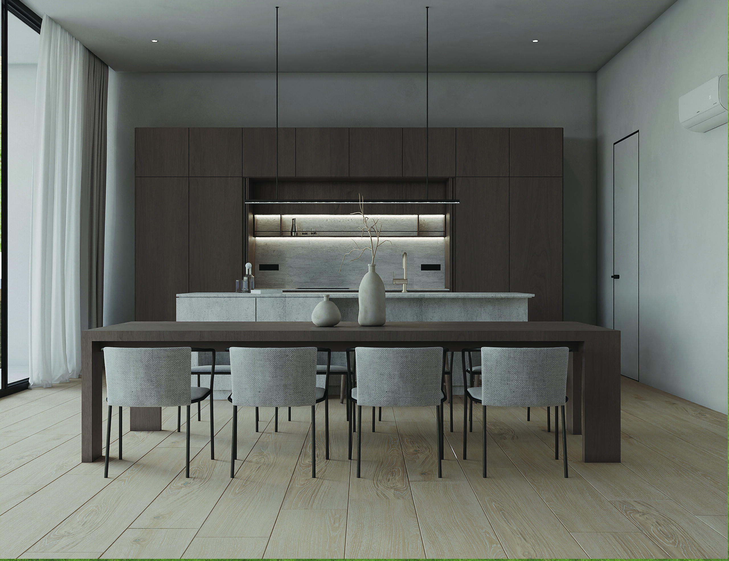 BRASA. Minimalistinio horizontalių ir vertikalių linijų dizaino itališka aliuminio profilių sistema„STILI PHOS“ su paslėpto apšvietimo galimybe tinka ir svetainės zonoje, ir sandėliavimo patalpose. Įeinamoje drabužinėje ir virtuvės balduose integruotas to paties gamintojo „Häfele“ LED apšvietimassu išmaniąja sistema „Mesh“. Ši sistema užtikrina energinį efektyvumą ir gerokai mažesnes elektrossąnaudas, idealiai atliepia šiuolaikinius tvaraus dizaino principus.