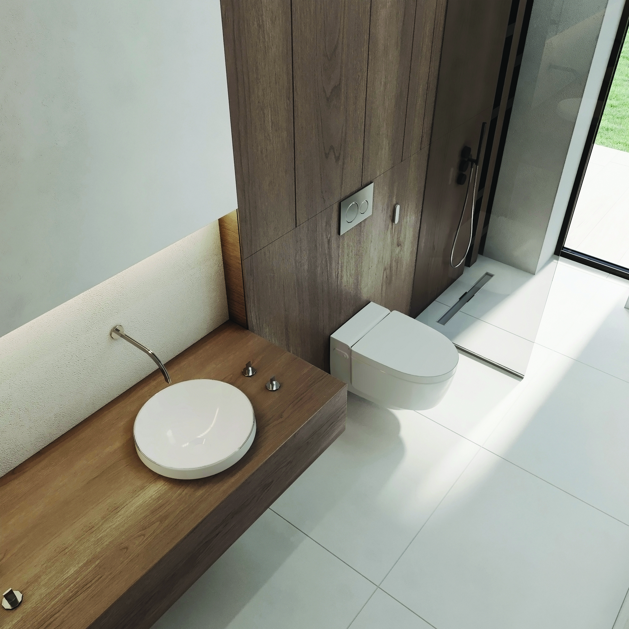 GEBERIT. Pasirinktas vandenį taupantis unitazas „AquaClean Mera Comfort“ su apiplovimovandeniu funkcija ir šildoma sėdyne. Švarią, subalansuotą estetiką užtikrina vonios spintelėje integruotiiš dalies įleidžiami praustuvai „Geberit VariForm“. Dušo zonai pasirinktas latakas „CleanLine20“ – elegantiškas, higieniškas ir paprastai prižiūrimas.