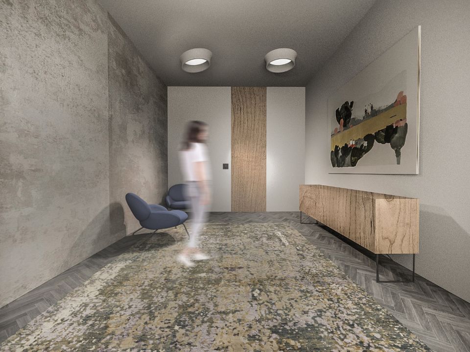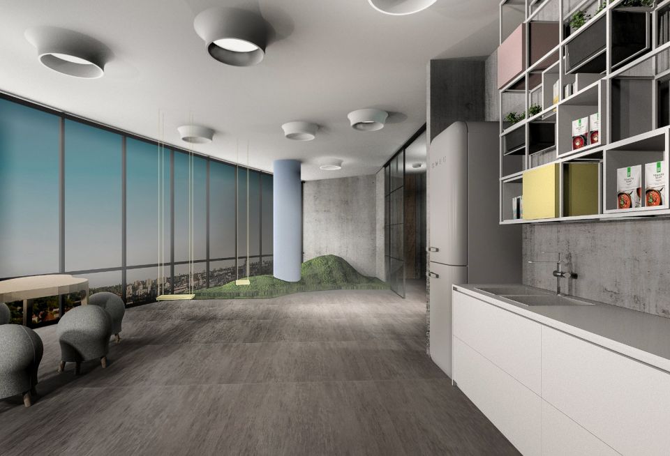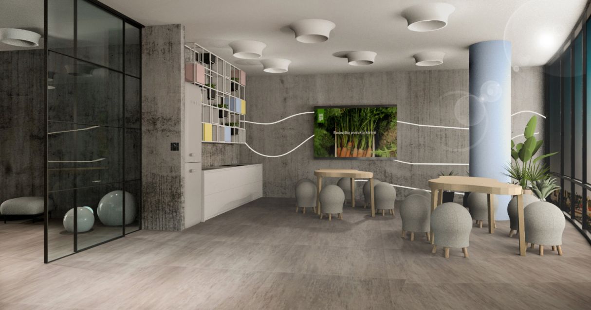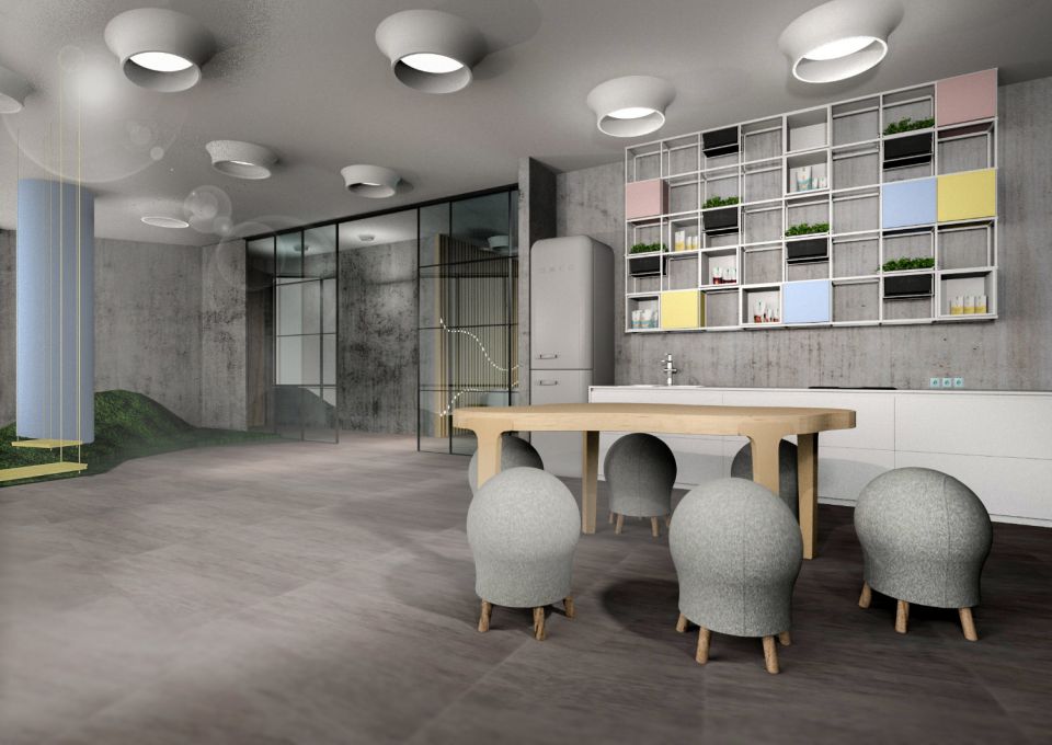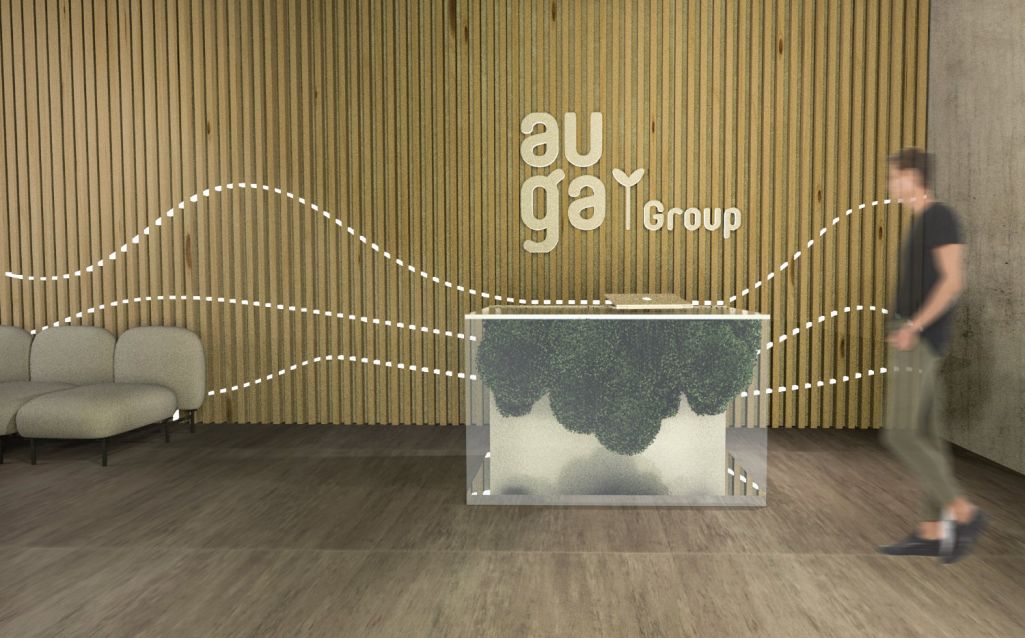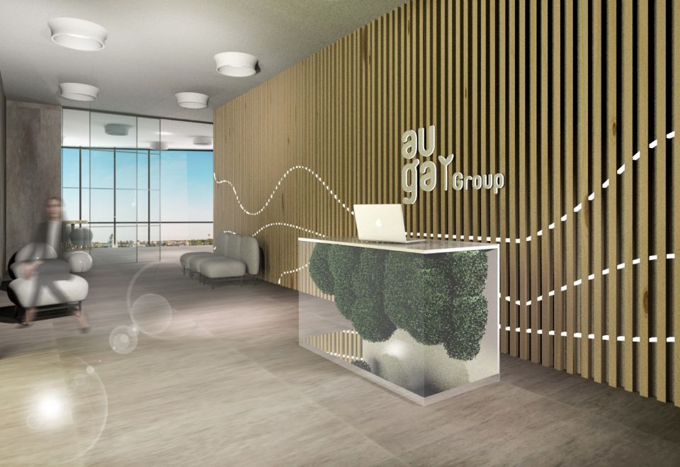 Ekologiškų produktų „AUGA“ biuro interjero idėja. Perteikiant gamtos formas ir švelnų namų dvelksmą, siekiama sukurti jaukų, lengvą, žaismingą interjerą. Interjeras įkvėptas gamtos, kuri pasireiškia baldų formomis, šviestuvais, medžiagomis, dekoro elementais, registratūros stalu. Projektuojamame biure numatytos šios zonos: darbo erdvė, pasitarimų kabinetas, direktoriaus kabinetas, registratūra ir poilsio zona kartu su virtuvėle / produkcijos pristatymo erdve. Poilsio / produkcijos pristatymo zona – tai neformali erdvė, kurioje galima pristatyti produktus, gaminti maistą, diskutuoti. Taip pat poilsio erdvėje suformuotas kalniukas, ant kurio galima pailsėti, dirbti ar tiesiog pasvajoti. Sukurta erdvi darbo zona, šalia pasitarimų kabinetas, atskirtas stiklinėmis stumdomosiomis durimis, kurios sujungia šias dvi erdves. Registratūrai sukurtas išskirtinis stalas, kurio viduje suformuota samanų kalnų kompozicija, o apačioje – veidrodis, kuris atspindi samanas. Šis apverstas kalnų fragmentas pereina į ant sienų šviesos diodų (LED) juostomis suformuotus kalnus. Interjere stengiamasi sukurti kitokį gamtos jausmą, augimą. Kiekvienam darbuotojui pritaikyti darbo stalai, kėdės pagal jų poreikius, kad kiekvienas darbuotojas jaustųsi komfortabiliai ir produktyviai. Taip pat darbuotojai gali dirbti tiek darbo, tiek poilsio zonose, gali laisvai keisti poziciją iš sėdimos į stovimą. Biuras valdomas kompaktišku patalpų valdikliu su ekranu, skirtu apšvietimui, temperatūrai ir žaliuzėms valdyti.