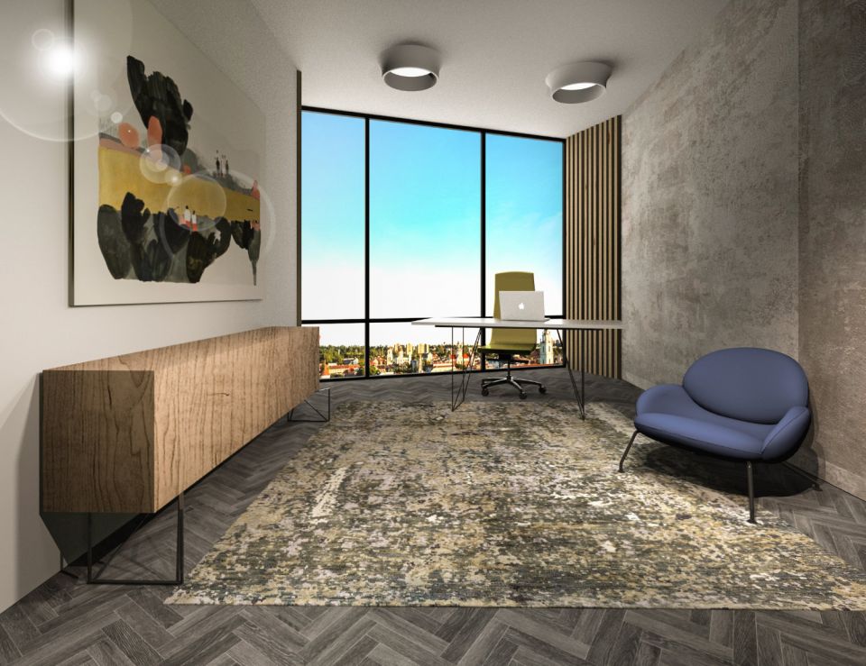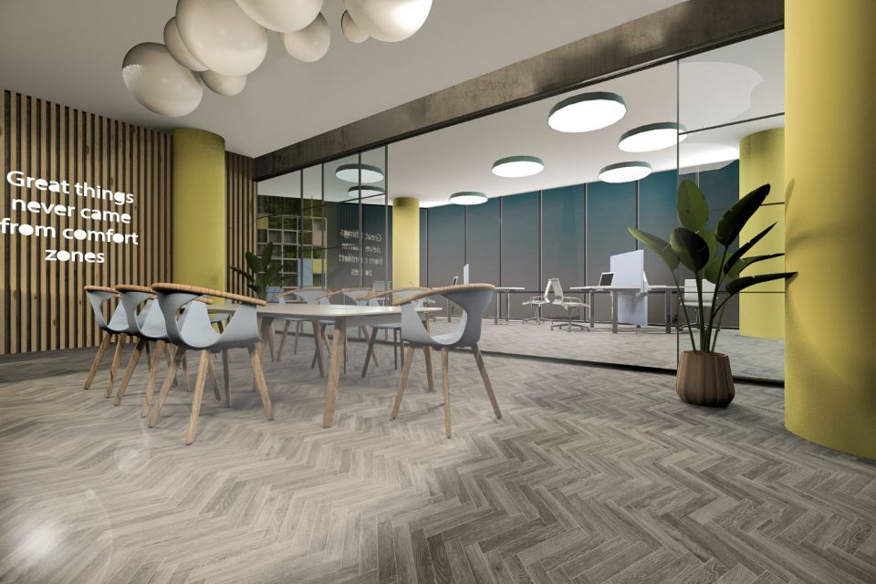 INTERJERO LINIJA. Grindų paviršiams darbo, pasitarimų zonose ir vadovo kabinete naudojamos kolekcijos „Amtico Abode“ šiltai pilkšva grindų danga. Pasirinktos medžio imitacijos grindys, siekiant sukurti jaukumą, namų šilumą.