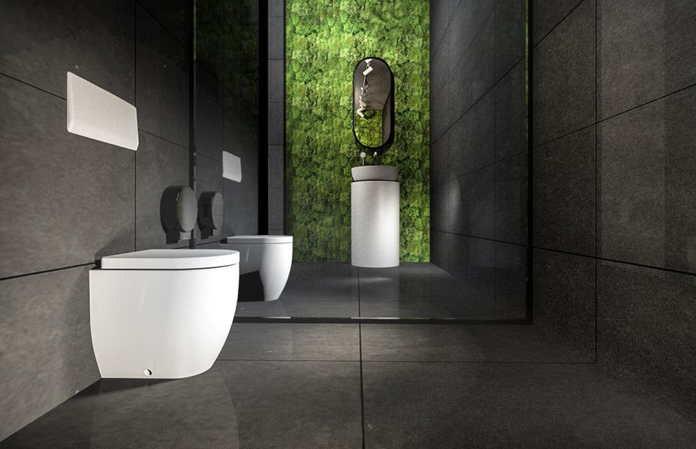 INTERJERO SALA. Darbuotojų tualetuose parinkti ispanų gamintojo „Noken“ kolekcijos „Arquitect“ (100048291) pastatomi unitazai. Naudoti balti, organinės formos, atitinkantys interjero temą, gamtinių formų. Taip pat tualete naudotas gamintojo „Noken“ serijos „Lounge square“ ant stalviršio pastatomas praustuvas (BLANCO 100170819 | N379000024). Tualeto interjeras įrengtas tamsesnis, o santechnika pasirinkta balta, kad išryškėtų produktų formos.
