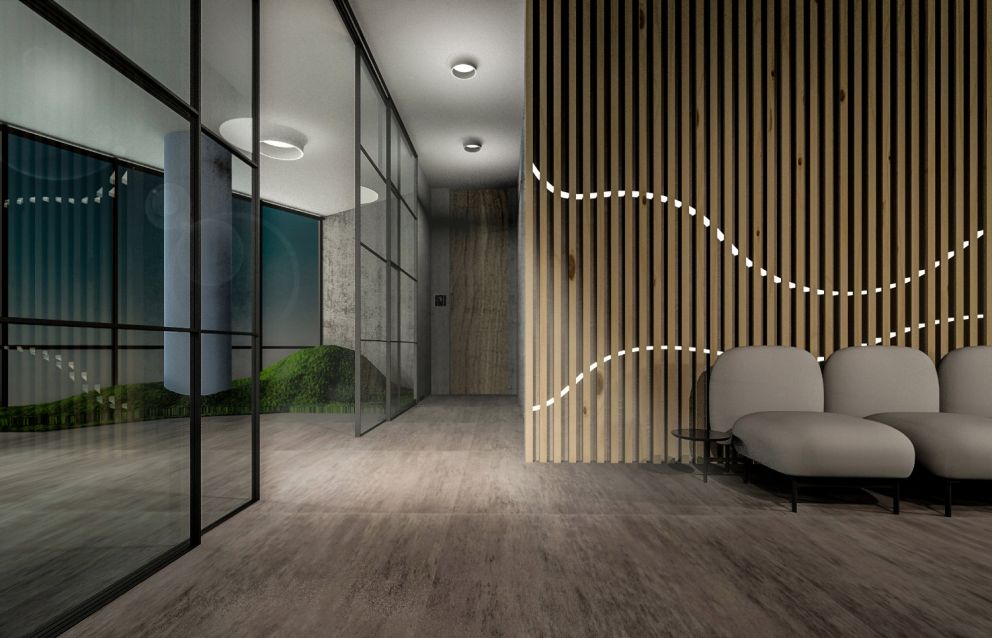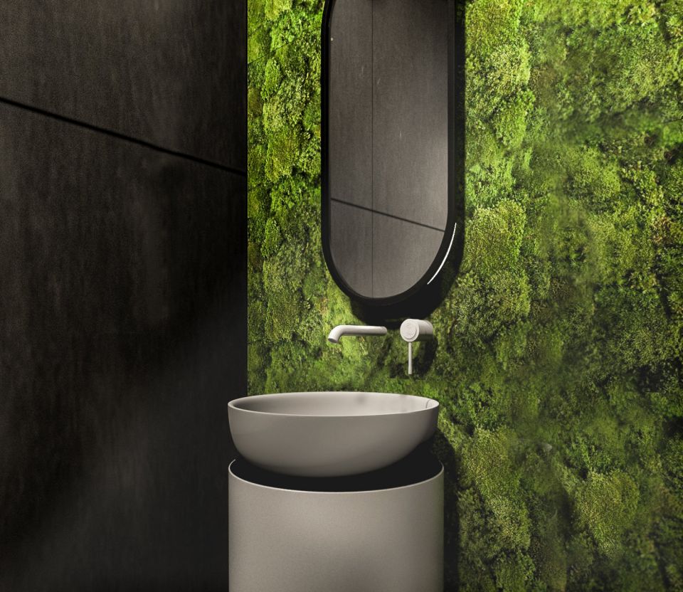 GAJA DECOR GROUP. Interjere naudojamas kupstelių samanų dekoras, atsiskleidžiantis ant sienos darbo zonoje. Samanų kompozicija taip pat sukurta WC zonoje ir registratūros stalo dekorui. Kupstelių samanų sienos suteikia žavesio bei gyvumo, leidžia pasijusti lyg gamtoje.
