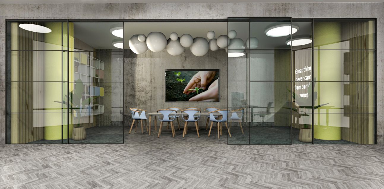 ECOPHON. Darbo ir pasitarimų zonose pasirinktos akustinės lubų plokštės su paslėpta konstrukcija „Ecophon Combison Uno Ds“. Šios plokštės vienu metu išsprendžia ir garso izoliacijos tarp gretimų patalpų, ir akustikos problemą patalpoje. Pasirinkta spalva balta „Akutex FT White“.
