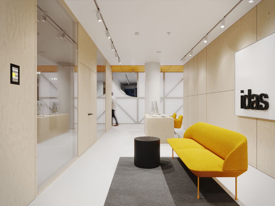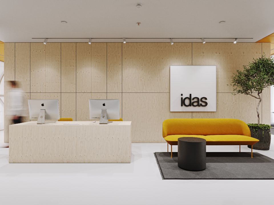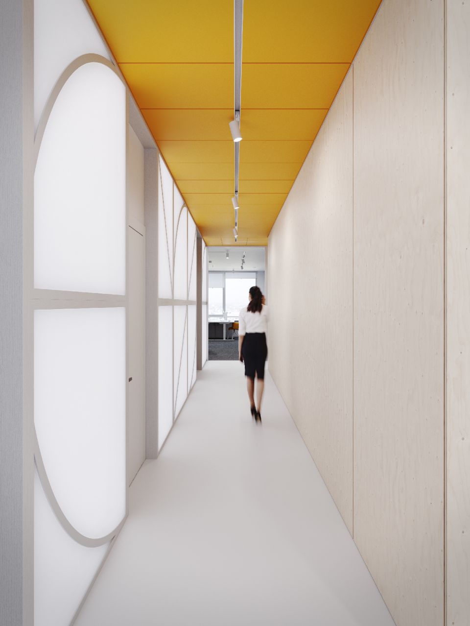 Interjeras dažnai tampa kompanijos vizitine kortele. Na, o darbuotojų elgesys glaudžiai susijęs su žmogaus, kaip visavertės asmenybės, vertinimu. Galima džiaugtis, kad dabar darbo erdvėje ypač svarbia vertybe tampa darbuotojo sveikata ir jo santykis su šeima bei socialine aplinka. Kuo labiau kompanijos strategijoje vertinamas darbuotojas, kaip socialine būtybe, tuo geriau jis jaučiasi, tuo geresnių rezultatų pasiekia. Sukūrėme biuro interjero koncepciją, paremtą šiomis vertybėmis: žmogaus individualumas, sveikatingumas, darbo aplinkybių pasirinkimo laisve ir galimybė kontroliuoti asmeninį laiką, skirtą šeimai bei turiningam ir aktyviam laisvalaikiui. Kurdami tiek atvirą naujovėms, tiek besilaikančią vertybių strategiją, erdves planavome taip, kad bet kuri kompanija, galinti dirbti atvirose darbo erdvėse, įsikurtų lengvai ir greitai, prisitaikydama savo sukurto įvaizdžio spalvinį sprendimą interjere. Biuro išdėstymas palankus tiek individualiam, tiek komandiniam darbui. Pagrindinis interjero akcentas – visas erdves jungianti akustinė pertvara su integruotu apšvietimu.