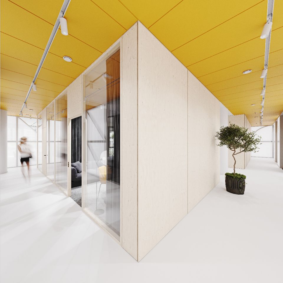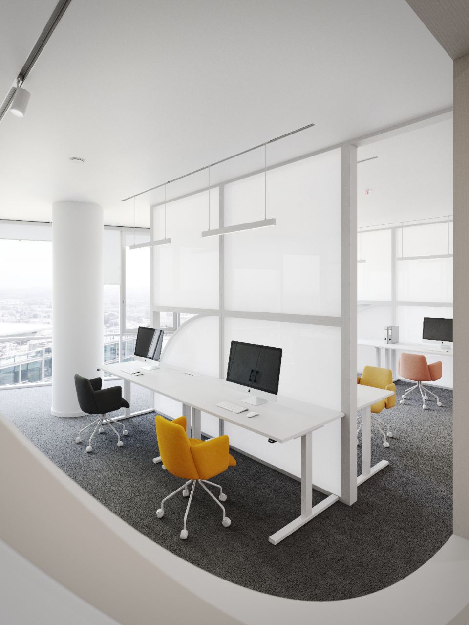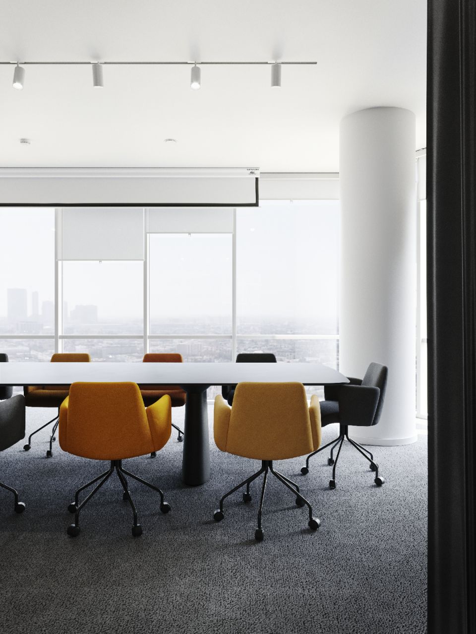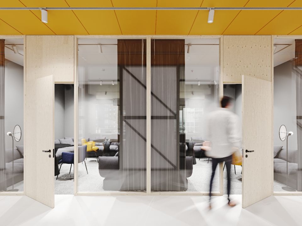 DOMUS LUMINA. Siekiant maksimalaus darbuotojų komforto, numatytos ritininės užuolaidos, kurios padės kontroliuoti natūralios dienos šviesą ir jaustis biuro erdvėse dar patogiau.