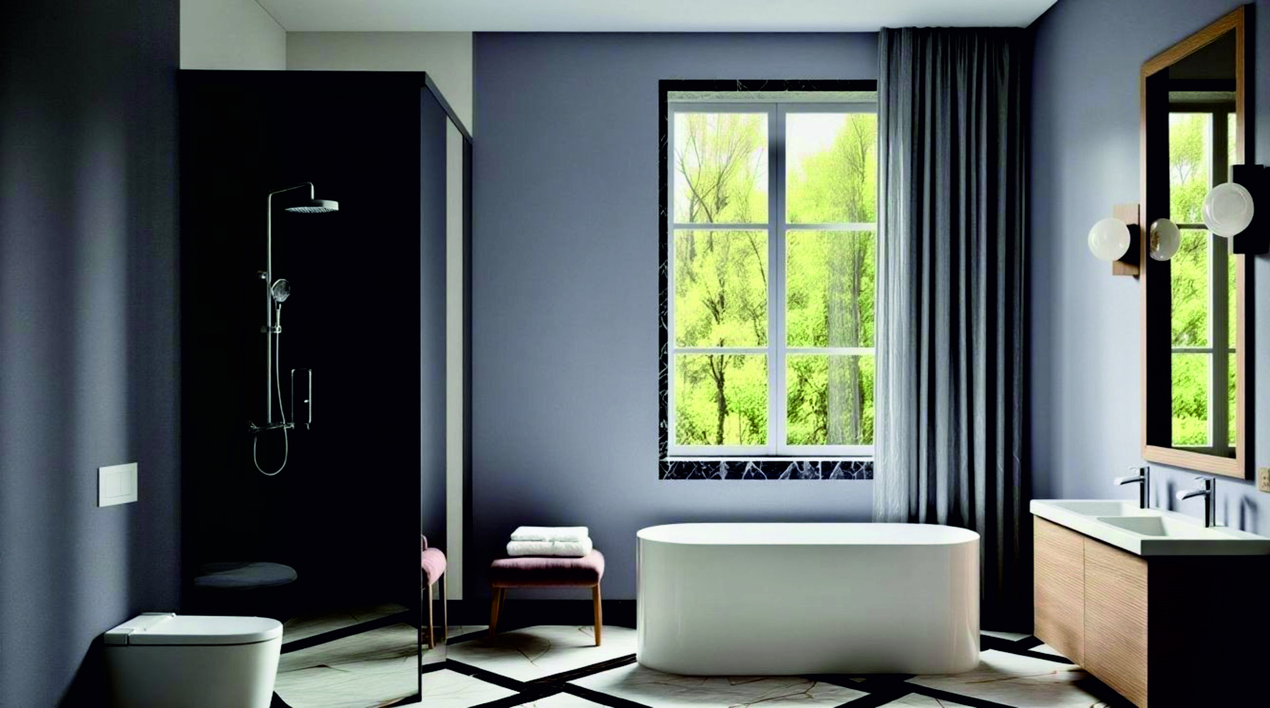 GEBERIT. Dėl funkcionalumo ir svečių komforto vonios kambario interjerui pasirinkti dvigubas praustuvas „Geberit iCon“, dvigubo praustuvo spintelė „Geberit Acanto“ – matiniu ąžuolo spalvos korpusu, dviejų stalčių ir su dviem vidiniais stalčiais, taip pat lavos spalvos rankena. Pritaikytas pakabinamas WC puodas „Geberit AquaClean Sela“ su apiplovimo funkcija, taip pat kampinis vandens nuleidimo mygtukas „Sigma40“ su dviejų vandens kiekių nuleidimo funkcija.
