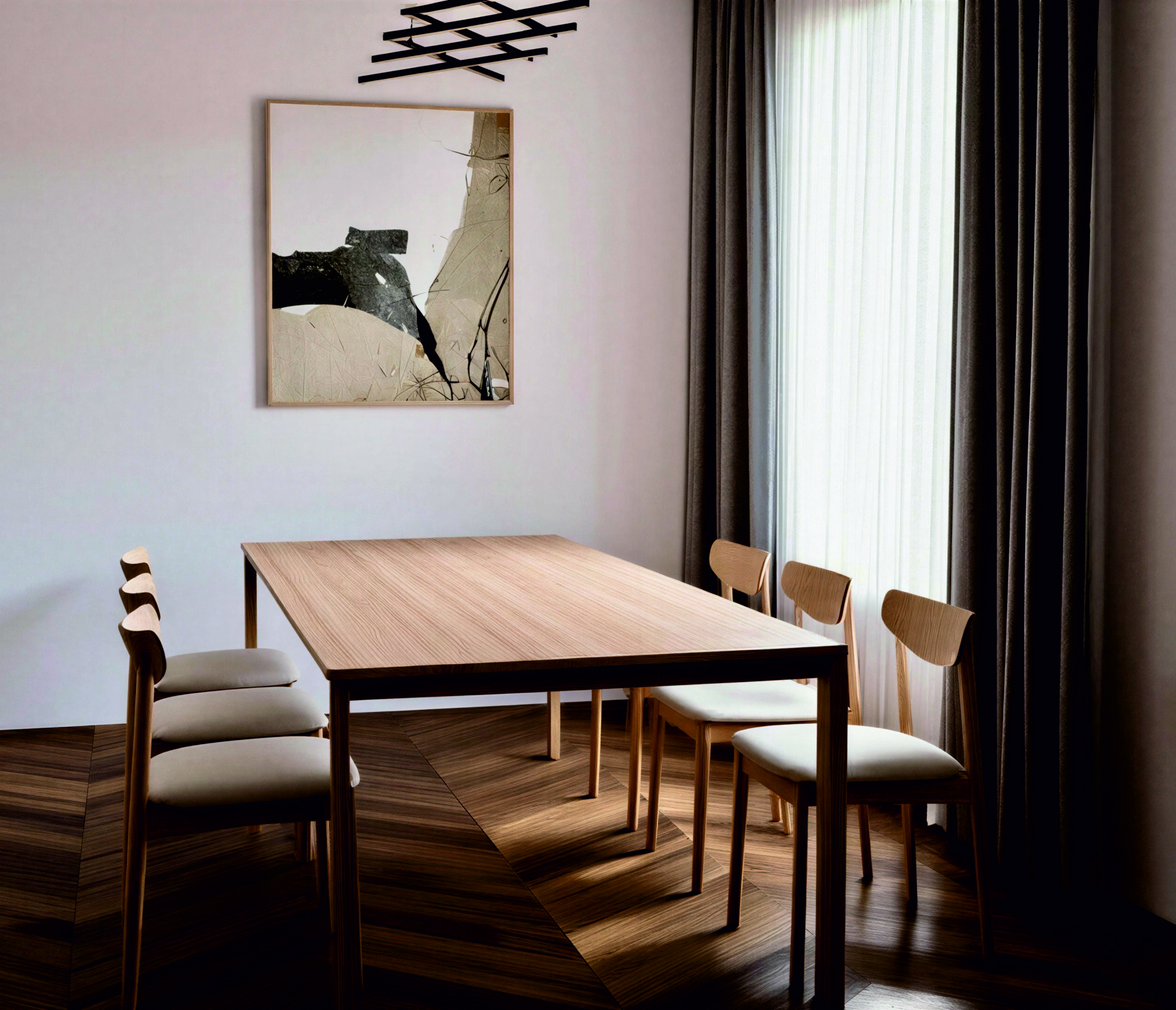 GRINDŲ ARSENALAS. Siekiant maksimalaus svečių komforto, pasirinktos natūralios parketo grindys „Oak Trapani Herringbone 130“: trisluoksnės parketlentės, kurių paviršiaus sluoksnis – ąžuolo mediena.