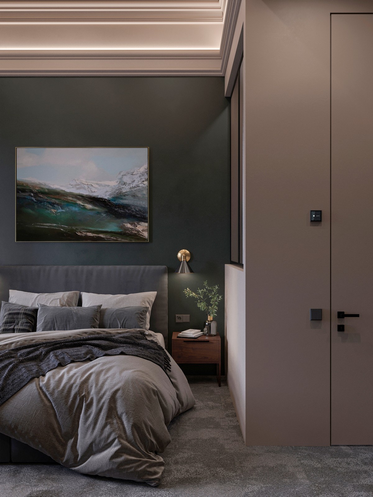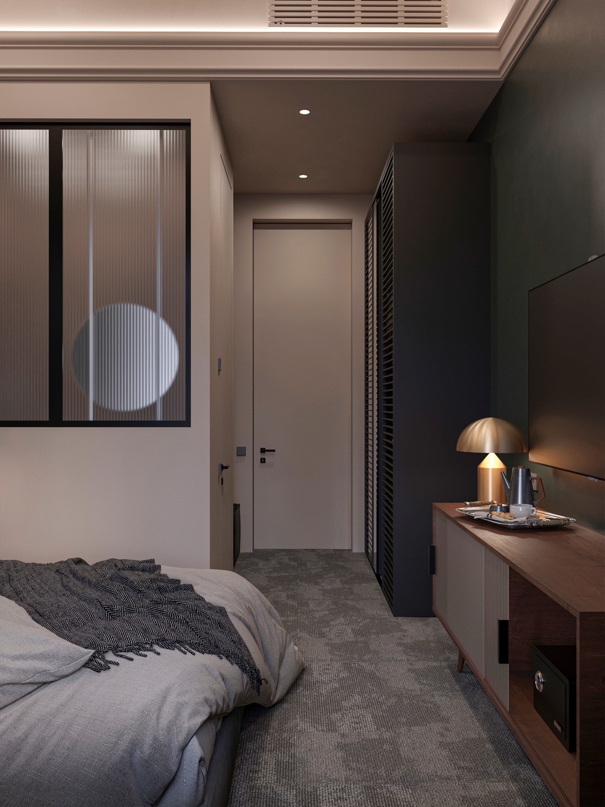 TARKETT. Miegamajame kambaryje ypač svarbus jaukumas ir šiluma, todėl grindims buvo pasirinktos „Desso“ prekės ženklo kiliminės plytelės iš „Airmaster“ kolekcijos. Dėl savo konstrukcijos, vaikštant, darinėjant duris, jos neleidžia nukritusioms ant žemės dulkėms ir kitoms smulkiosioms dalelėms kilti į viršų iki kvėpavimo takų – sulaiko dulkes apačioje ir leidžia kvėpuoti švaresniu oru kambaryje.