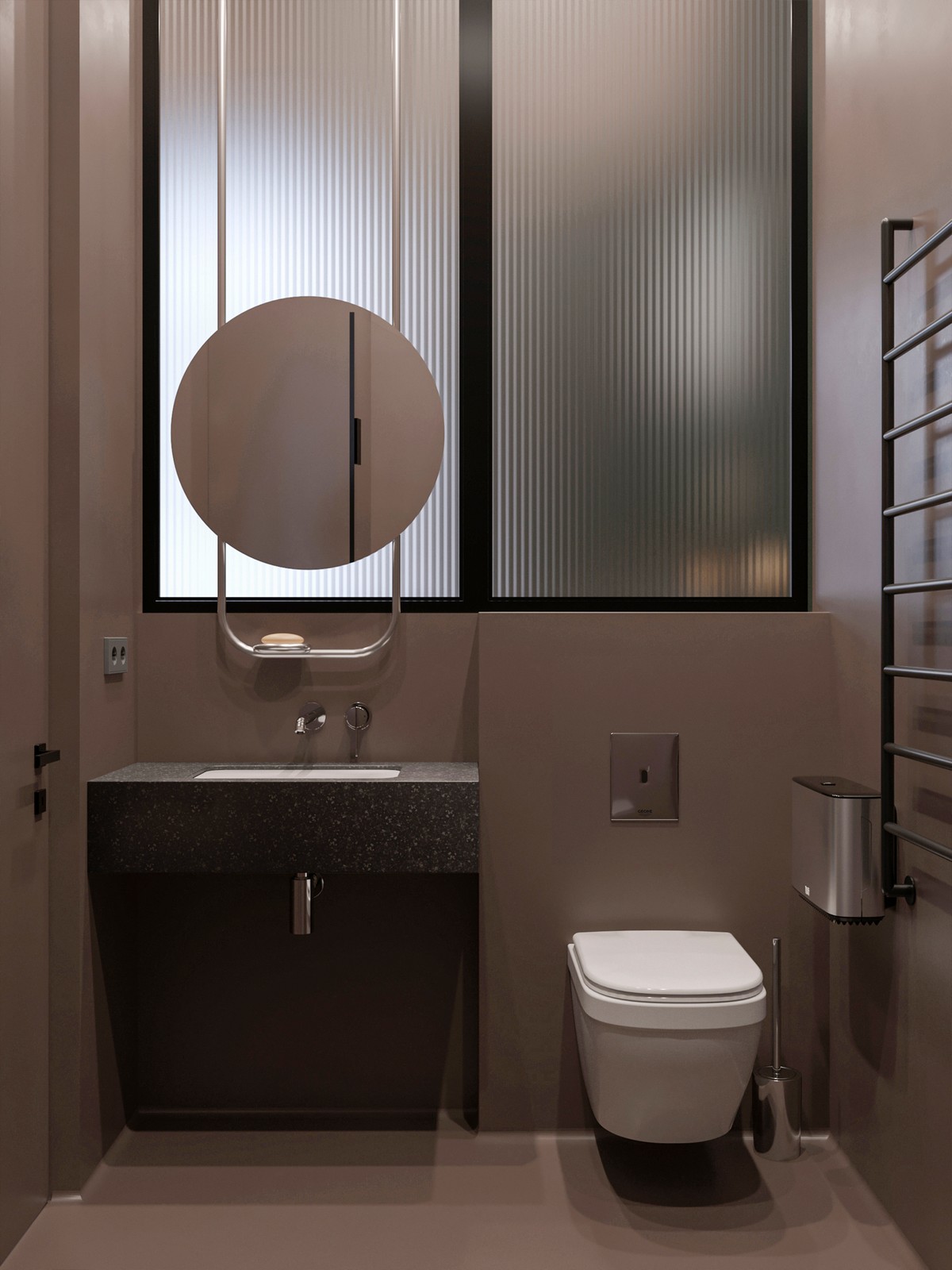 Praustuvui pasirinktas montuojamas prie sienos maišytuvas „Essence Two-Hole Basin Mixer“. Pakabinamas unitazas iš „Euroceramic“ kolekcijos su mygtuku „Tecton Bau E“, kuris veikia nuo inovatyvios „Infrared“ sistemos. Šis mygtukas padeda užtikrinti geresnę higieną ir mažesnį energijos suvartojimą.